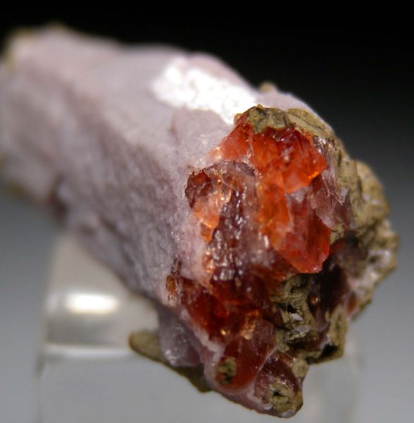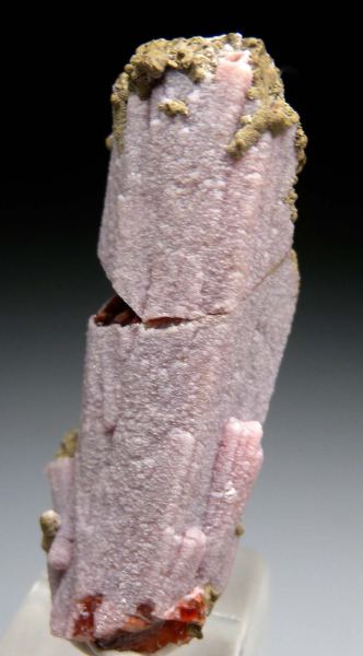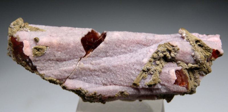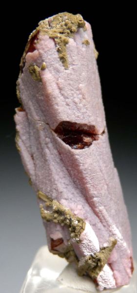 Large single Rhodochrosite crystal from Mexico. The crystal displays a thin lighter pink, more opaque outer surface with a bright red, more translucent interior. There are minor amounts of stalactitic, olive green formations of an unknown mineral on each end, typical of some some Rhodochrosite from this locality. This crystal has one repair.Data last checked on 19th Nov 2025 - specimen may no longer be available