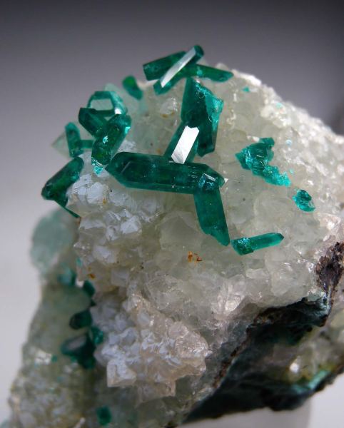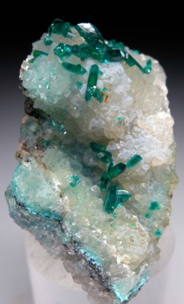 Rich green Dioptase crystals sprinkled atop drusy Quartz crystals over Chrysocolla. The Dioptase crystals are glassy and transparent and reach 9mm in size. There are some broken crystals but most are perfect, and wow, the transparent vivid green crystals atop clear Quartz crystals is stunning!Data last checked on 19th Nov 2025