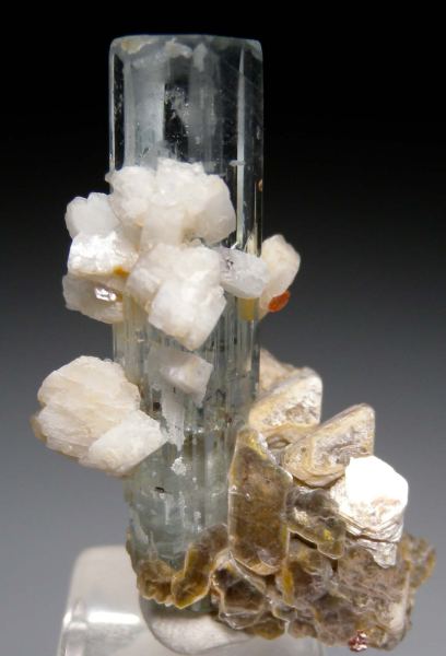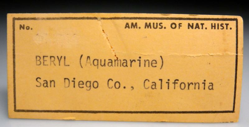Transparent, light blue Aquamarine crystal with attached Albite and Muscovite. Well crystallized all around and undamaged. This was in an old collection and came with an American Museum of Natural History label. The label only notes 'San Diego Co., California' and could possibly be from the Pack Rat Mine.Data last checked on 19th Nov 2025 - specimen may no longer be available