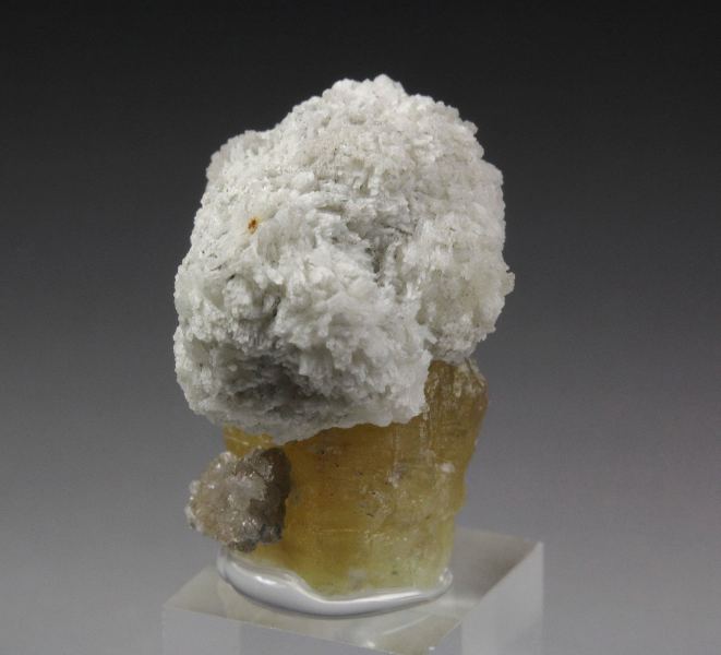 Very rare combination of weloganite crystal decorated attractively with strontianite from the locality that produced the best specimens for the species in the world Francon quarry, Montreal, Canada. The weloganite crystal is an irregular barrel shaped hexagon. It has growth striations and yellow color. White strontianite spherical clusters grow at the top. Complete all over – 360 degree. The mine is closed since decades. In excellent condition. On acrylic base., Cool!, Data last checked on 20th Nov 2025
