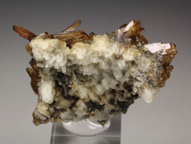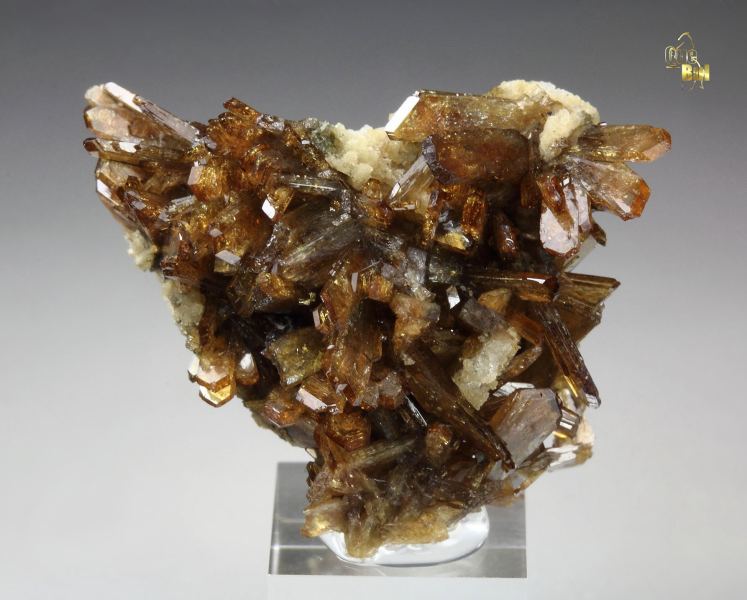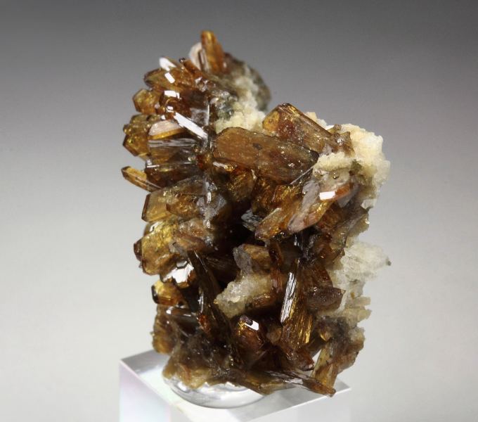 A marvelous and rare specimen of childrenite crystals Ilha claim, Taquaral, Minas Gerais, Brazil. It displays radial sprays of tabular blade crystals. They have rich tobacco color and sharp shape. The crystals are transparent, gemmy and lustrous. In very good condition - some small contacts. On acrylic base., Splendid!, Data last checked on 20th Nov 2025