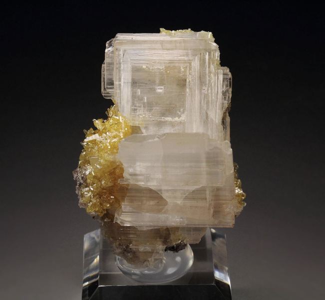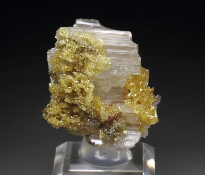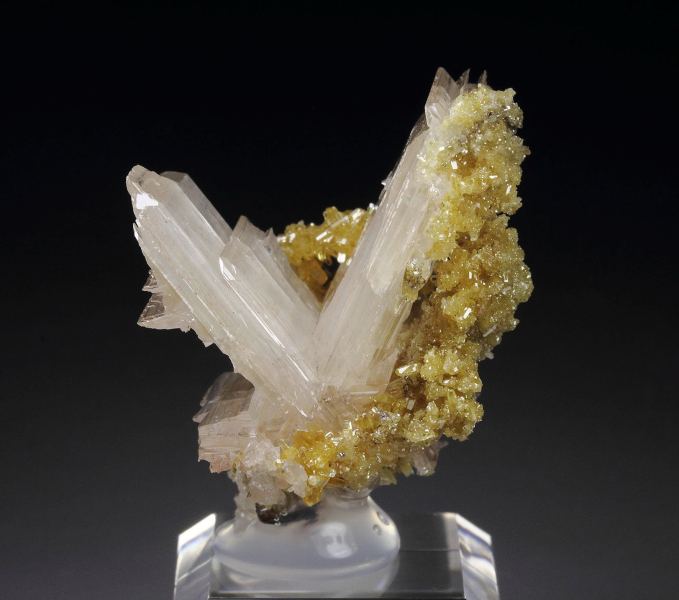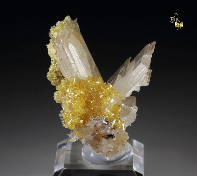 Astonishing and rare old specimen of reticulated cerussite attractively decorated with mimetite from this great locality - Tsumeb Mine, Namibia. It displays two main elongated, tabular crystals of cerussite, growing in a sculptural and very three dimensional V shape. The reticulated growth is due to cyclic twinning. The cerussite blades are very sharp and highly lustrous with good transparency. They are highly lustrous. Rich yellow mimetite crystals partially cover the cerussite. They are sharp, lustrous and sparkling. Some of them are transparent and gemmy. The piece is complete all over with very elegant stand. Some small damages. On acrylic base., Gorgeous mimetite – cerussite combo!, Data last checked on 20th Nov 2025