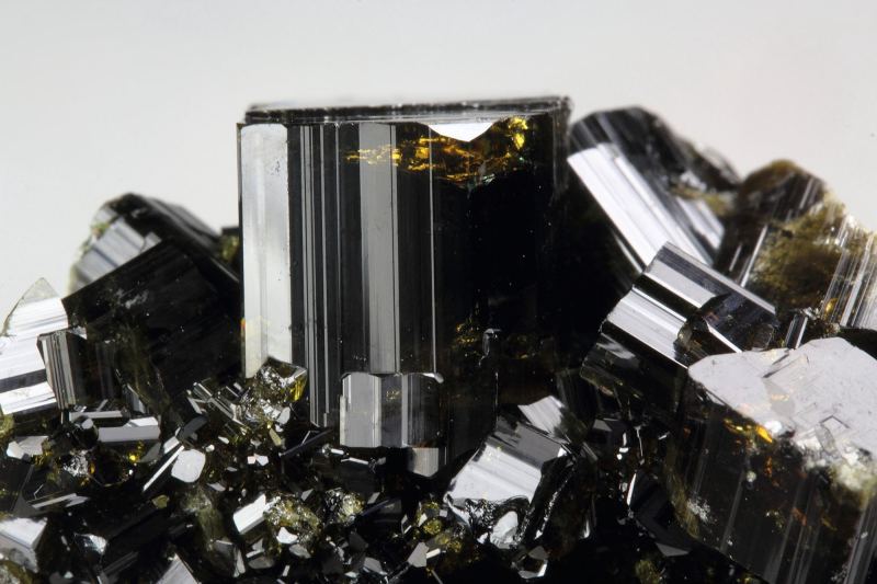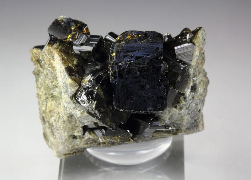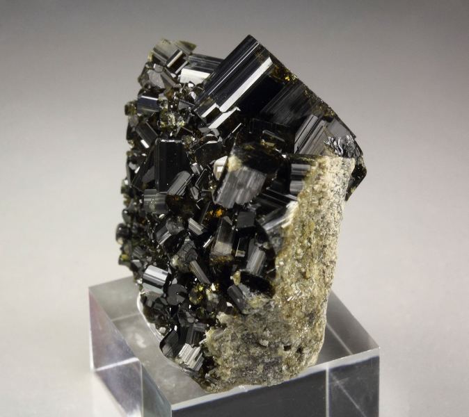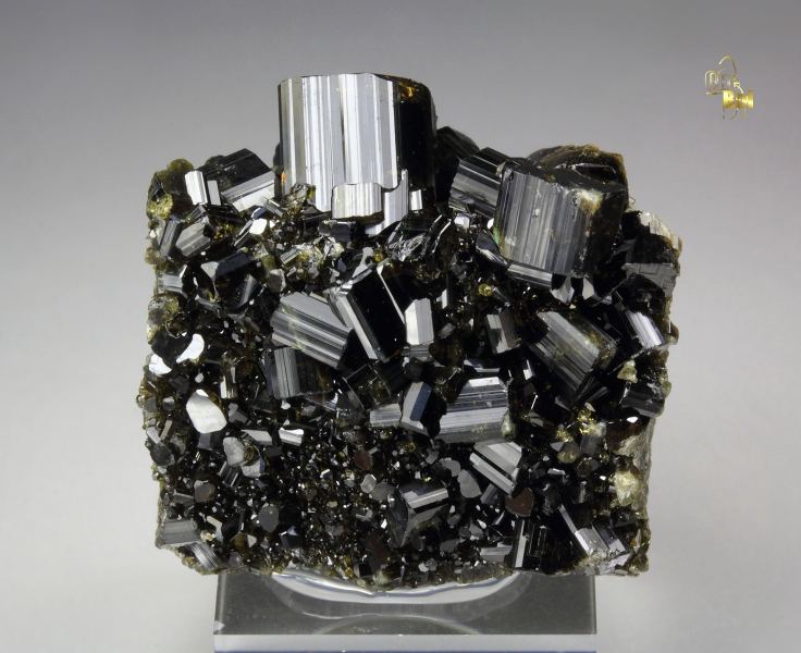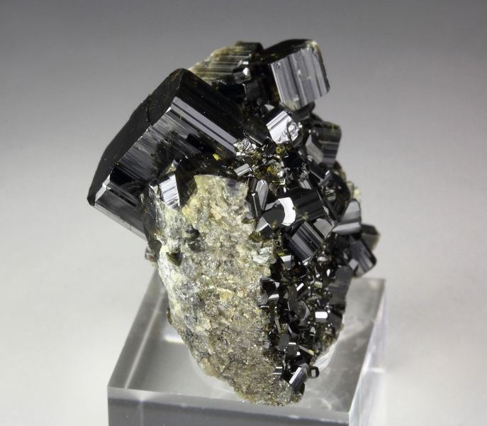 Fine vesuvianite crystals from Bellecombe, Aosta Valley, Italy. The crystals 11mm display very dark olive-green color. They are translucent to transparent, allowing light to play through its internal features. They are lustrous and well-formed sharp prismatic crystals. The main crystal at the top forms an aesthetic focal point. In very good condition - some small nicks. On acrylic base., Appealing piece!, Data last checked on 26th Nov 2025