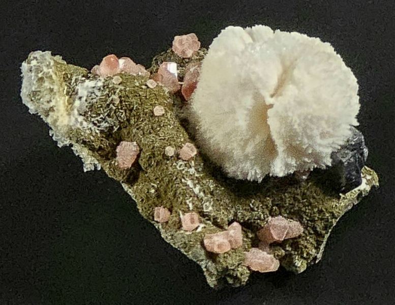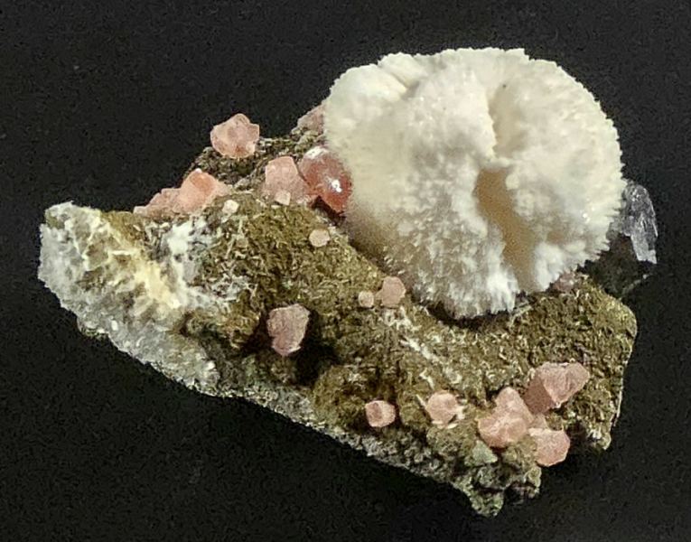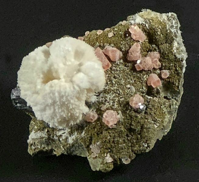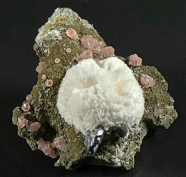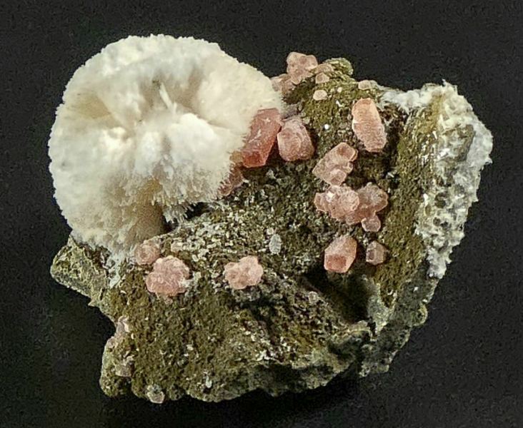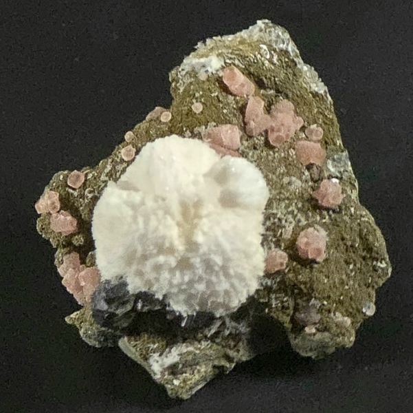 A rare and stunning specimen from a rare Mexican locality. Pink Rhodochrosite crystals, up to 5 mm in size, are scattered on a nicely contrasting matrix and a spherical aggregate of white Calcite to 2 cm is aesthetically perched atop the specimen. A small cluster of shiny black Sphalerite to 7 mm is nestled at the base of the Calcite. Mindat shows an example from this unknown locality in Zacatecas, which is known for its silver mines hosting Rhodochrosite and Sphalerite. A must have locality piece for any collector of Rhodochrosite and / or Mexico.ex. Paul Edwards collection; ex. Bob Griffis collection