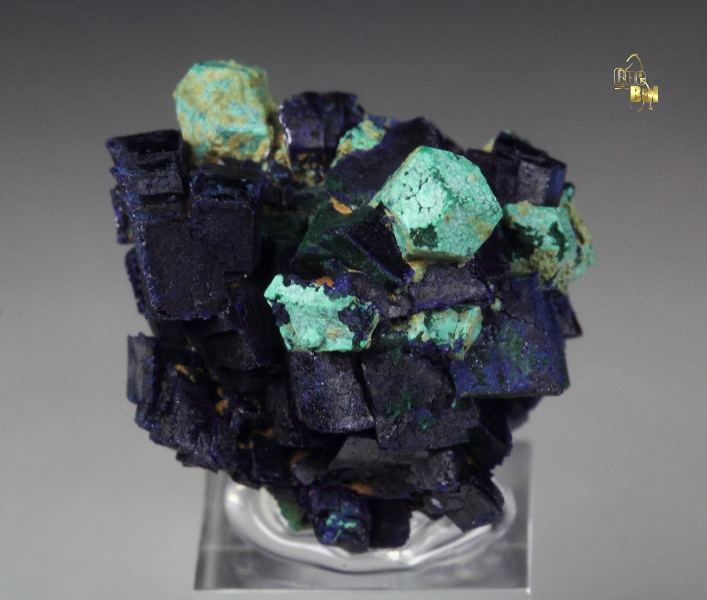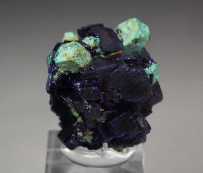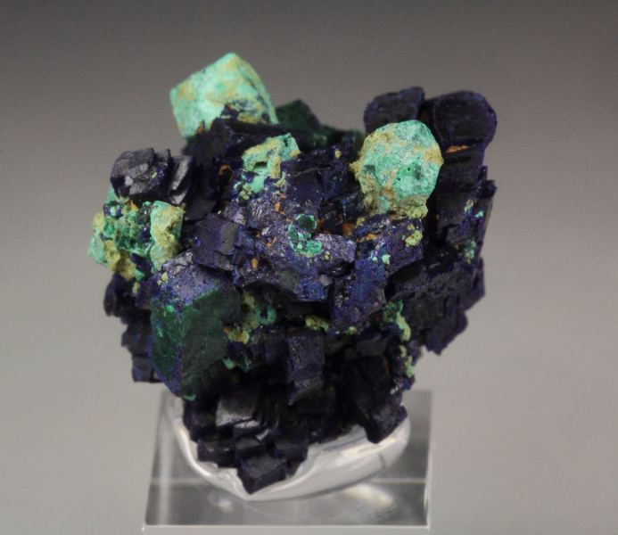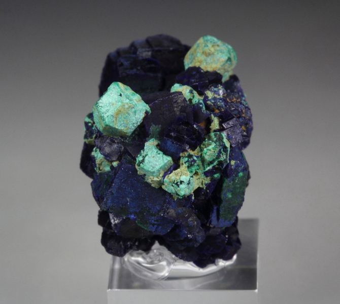 A fantastic malachite pseudomorph after cuprite on azurite base – old and highly desirable specimen from the famous Chessy, France. Chessy is one of the world’s classic localities for cuprite. The malachite completely replaces cuprite crystals to 3mm with sharp rhombic dodecahedral habit. They are aesthetically perched on dark-blue, sharp rhombohedral azurite cluster. That gives a super contrast. On some crystals is seen malachite pseudomorph after azurite. It shows nicely all over 360 degree. In excellent condition. On acrylic base., Wonderful double pseudomorph!, Data last checked on 30th Nov 2025