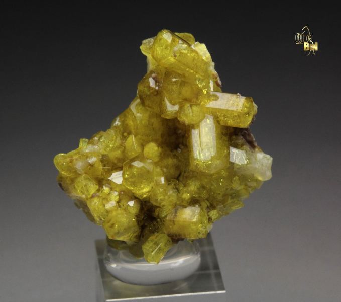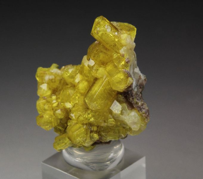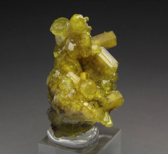 A striking canary-yellow ettringite crystals growing on a small base from the famous Kalahari manganese field, South Africa. It features sharp barrel shaped hexagonal ettringite crystals. They are lustrous with a rich and saturated color. The crystals are translucent to transparent and gemmy. In excellent condition – small outside edge contacts. On acrylic base., Fascinating ettringite!, Data last checked on 4th Dec 2025