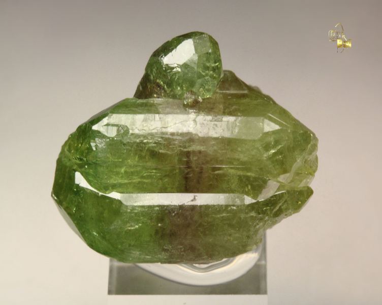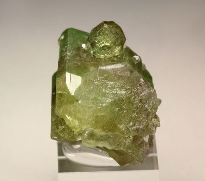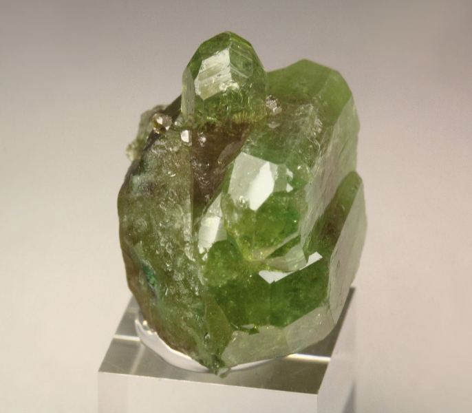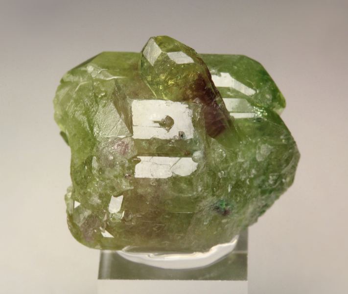 A cool specimen of bi-color gemmy vesuvianite crystals from the famous Jeffrey mine, Quebec, Canada. They have from minor purple color at the center to apple-green. The crystals are translucent to transparent and gem, with a strong glassy luster and are well shaped. Some are doubly terminated. The vesuvianite is very fresh and sparkling. Jeffrey mine produced some of the finest vesuvianite pieces in the world and this is a nice representative. The mine is closed since a long time. For references see the 2013 issue of The Mineralogical Record vol. 44, # 4. In good condition – some side contacts. On acrylic base., Splendid!, Data last checked on 4th Dec 2025