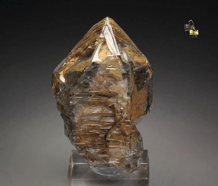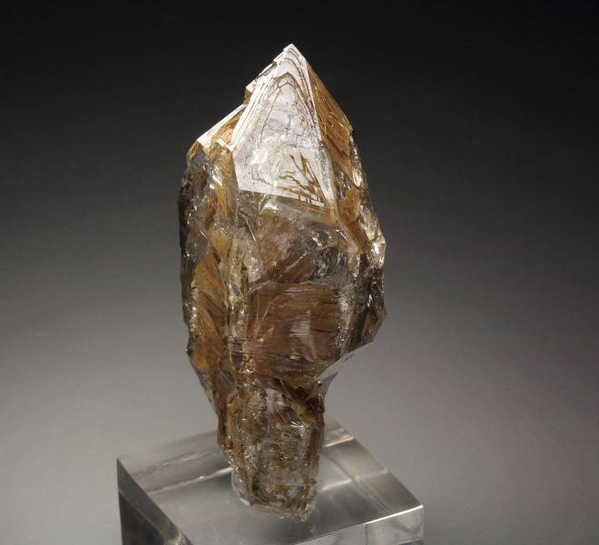 A first grade quality skeletal quartz crystal from Nervia Valley, Liguria, Italy. This is a choice specimen from this classic locality. The crystal is razor sharp and highly lustrous, glassy, completely transparent and water clear. It has superb skeletal features and beautiful clay inclusions, which are typical for this locality. The skeletal structure is caused by a fast growth of the mineral where the crystal faces do not have the time to be completed because the edges grow faster than the center of the faces. It displays attractively all over 360 degree. In excellent condition. On acrylic base., Superb!, Data last checked on 6th Dec 2025