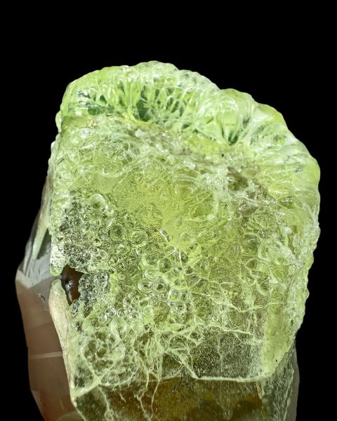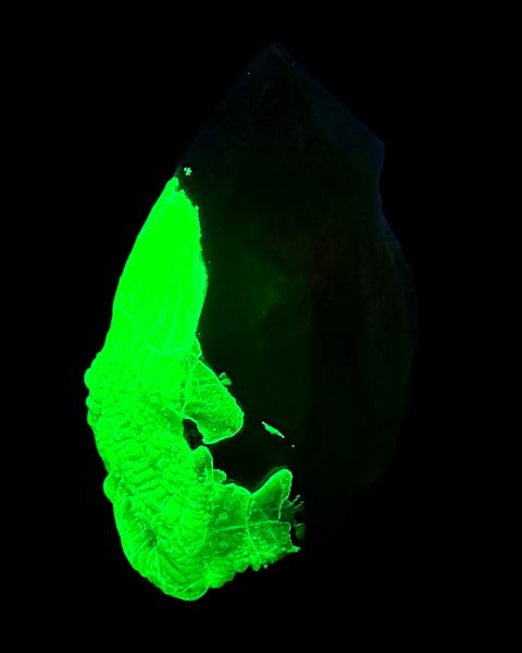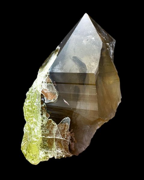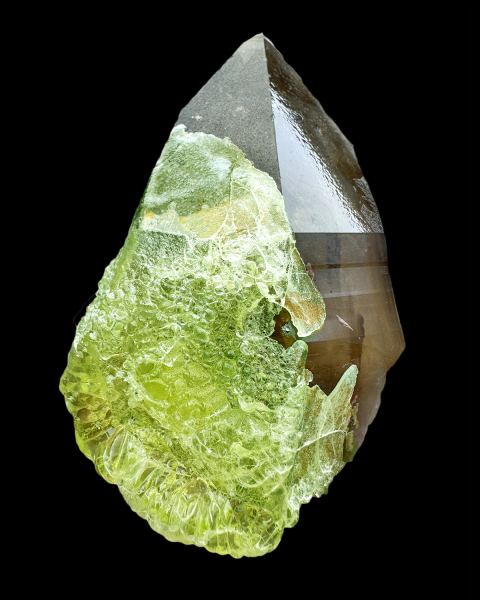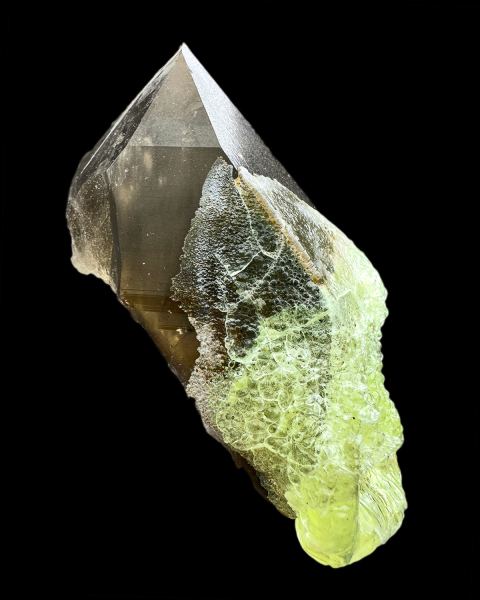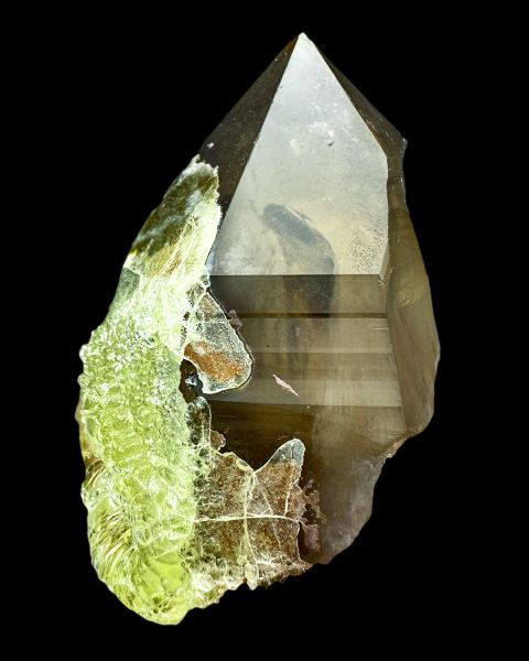 Aesthetic specimen of yellow (daylight fluorescent) hyalite opal, partly covering lustrous and translucent smoky quartz crystal. Extreme UV fluorescence.Data last checked on 10th Dec 2025