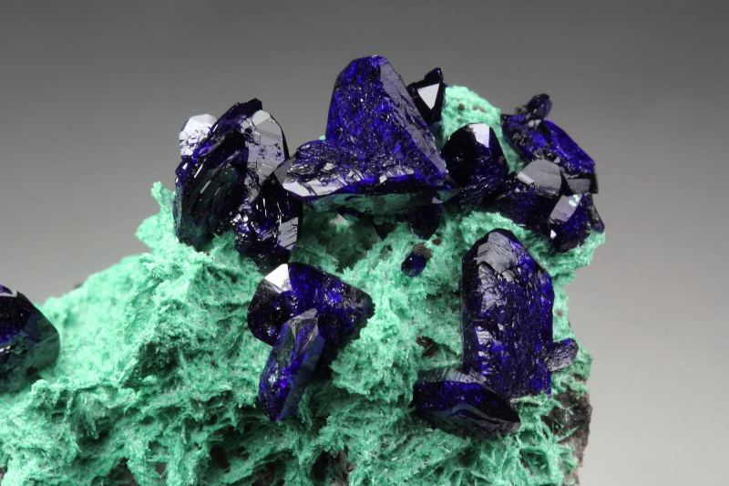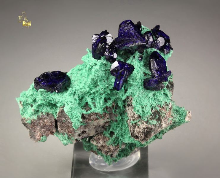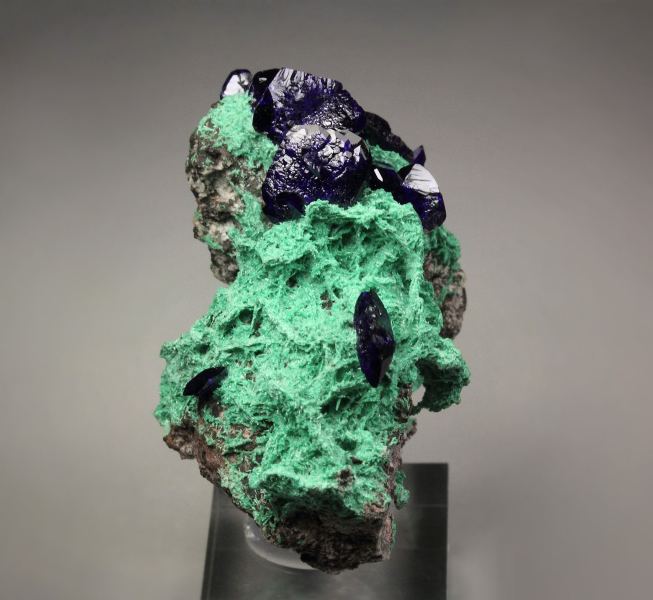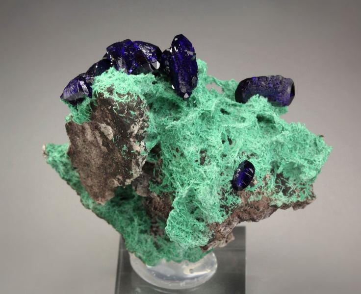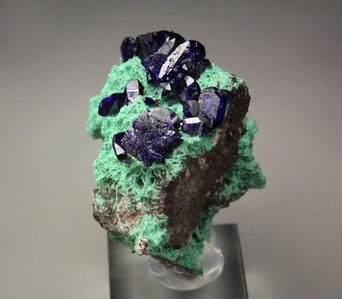 A stunning and highly sought-after specimen of azurite crystals aesthetically perched on a green malachite base from the renowned Milpillas Mine, Mexico. The piece features striking, well-terminated and complete tabular azurite crystals that are highly lustrous. The color ranges from deep to vibrant electric royal blue. The green malachite base provides a perfect contrast, highlighting the azurite beautifully. The azurite crystals at the top create impressive focal points, visible from all angles. For references see the 2021 issue of The Mineralogical Record vol. 52, # 5. In excellent condition. On acrylic base., Magnificent and highly prized by collectors!, Data last checked on 10th Dec 2025