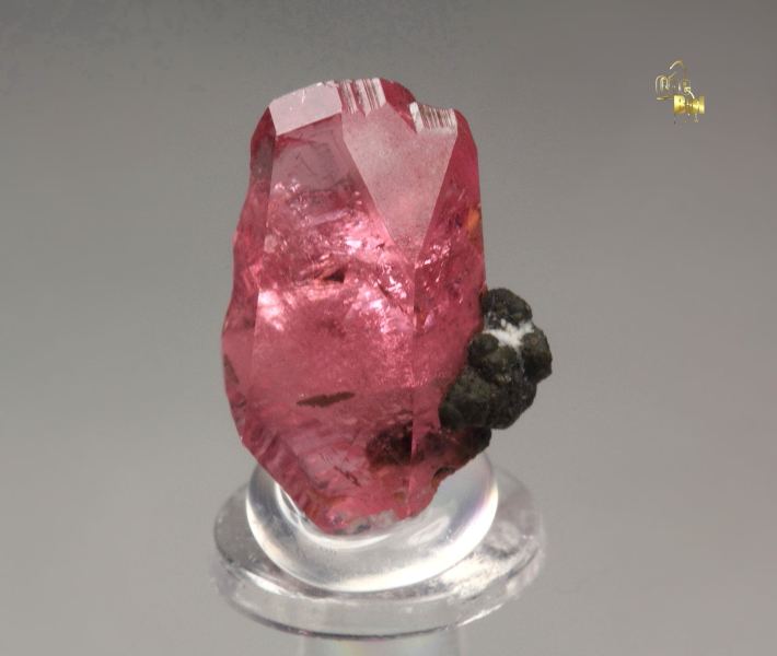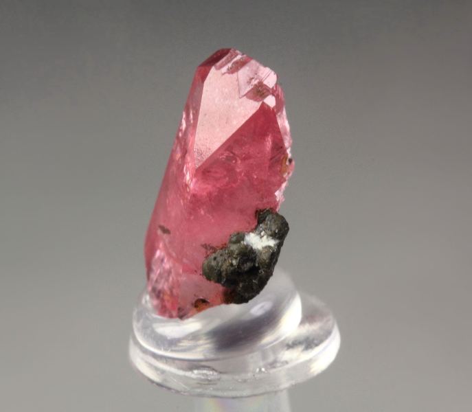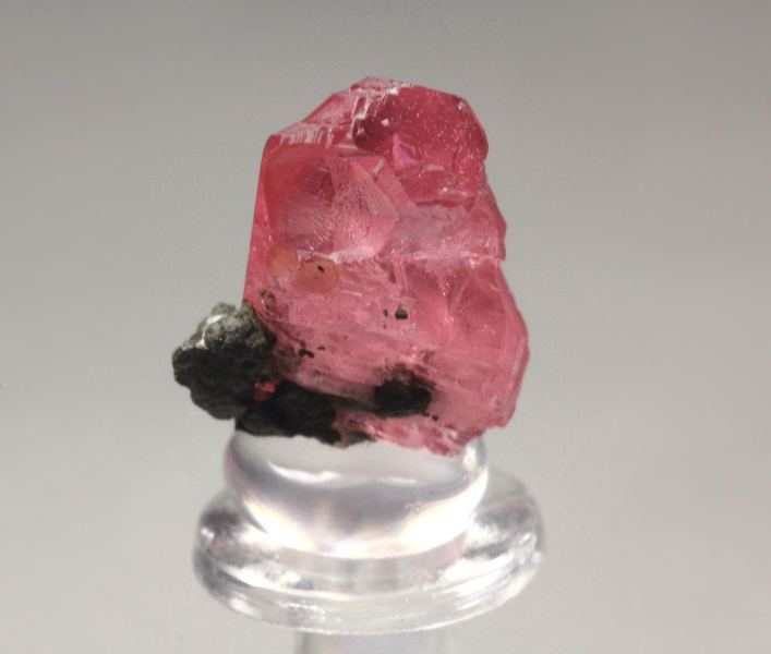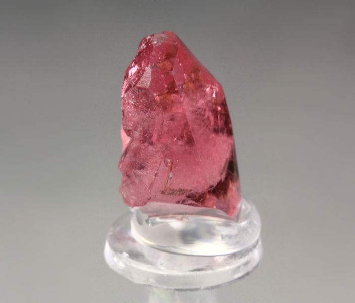 A cool gem rhodochrosite crystal from the famous Santa Eulalia District, Chihuahua, Mexico. It displays completely transparent, clear and gem rhodochrosite crystal of 10mm. It has a marvelous cherry-red color and sharp shape. The faces have a glassy luster. The quality is fine and the crystal glows. The deposit has produced these treasures long time ago and pieces like this have always been scarce. In very good condition – back side contacts. On acrylic base., Fantastic!, Data last checked on 10th Dec 2025