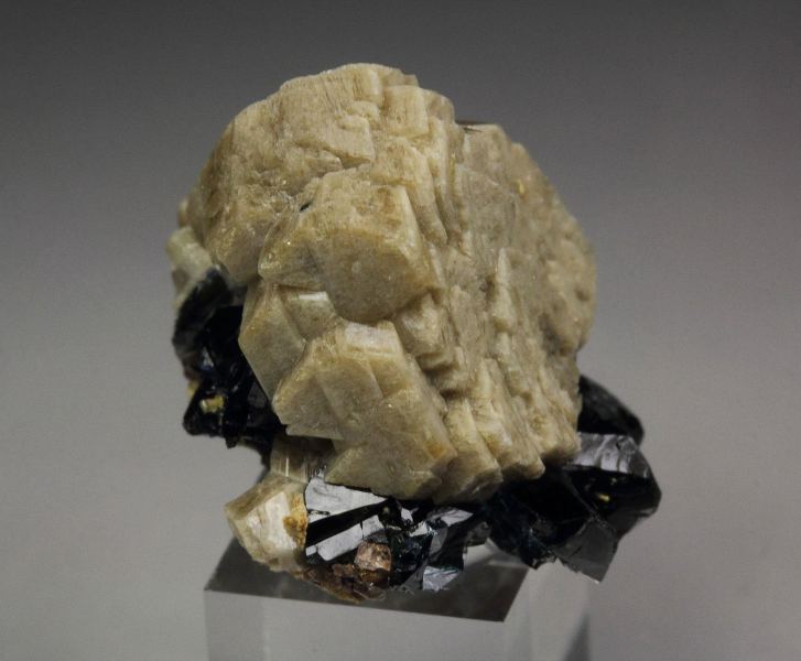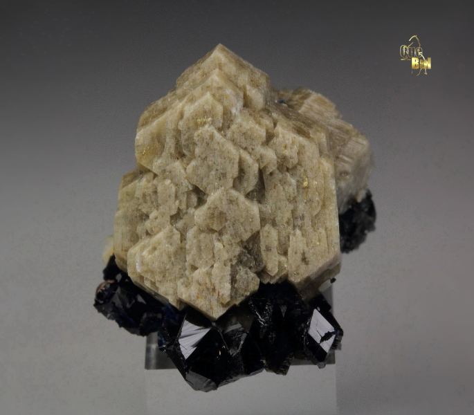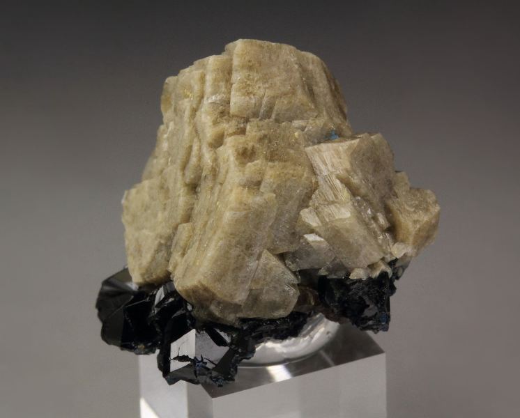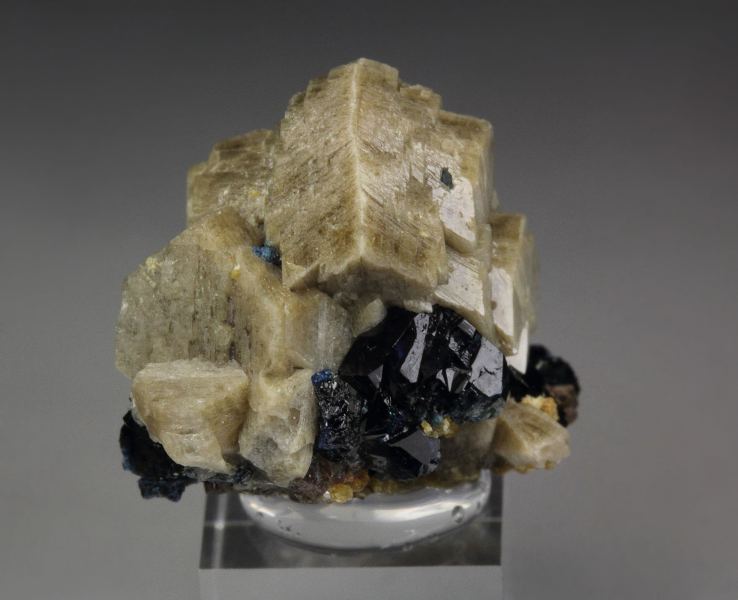 A fine specimen of whiteite (CaFeMg) from the famous phosphate deposit of Rapid Creek Yukon, Canada. Whiteite is a rare phosphate and some of the best are found in this remote Yukon locality. The crystals are a well formed, with sharp hexagonal habit and tan color. Some indigo blue lazulite crystals grow at the base part. They are lustrous and sharp. It displays aesthetically all over 360 degree. In excellent condition. On acrylic base., Superb whiteite!Data last checked on 10th Dec 2025