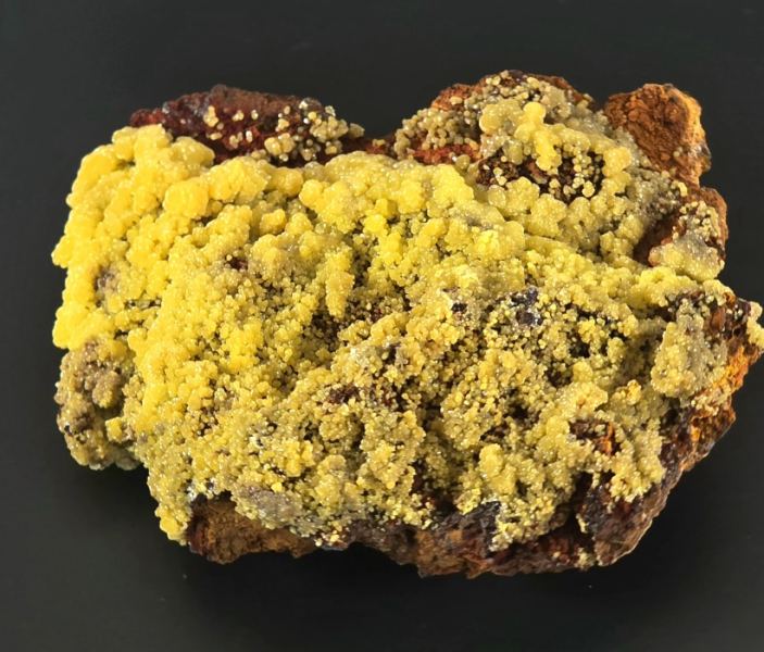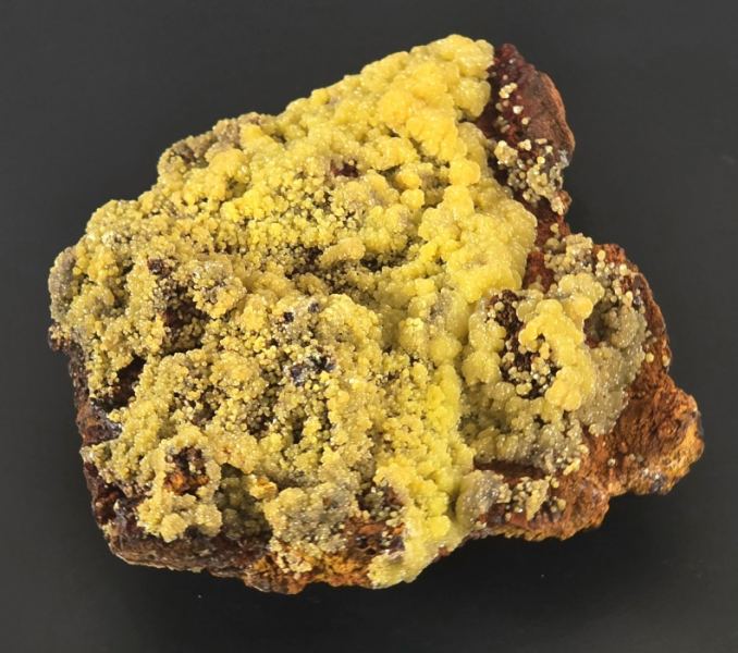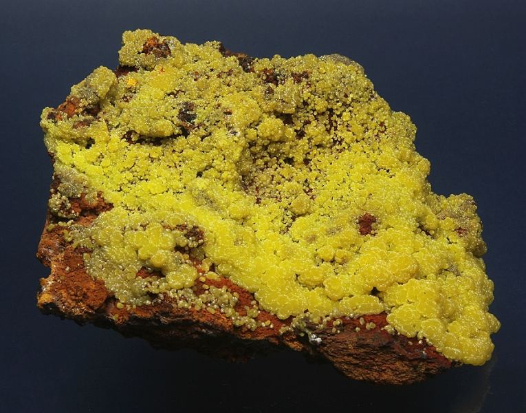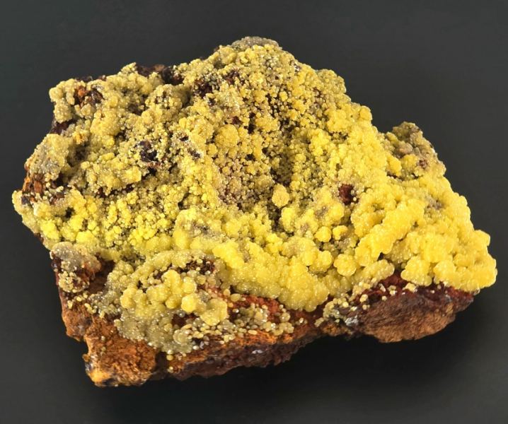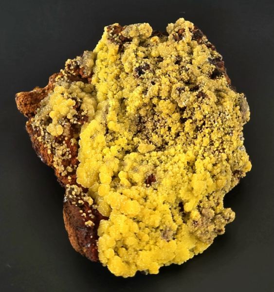 Yellowish, translucent Mimetite in spherical crystal aggregates to 8 mm in diameter cover a limonitic matrix from this classic and highly desirable Mexican locality. Dates from the 1960s or earlier when the Edwards collection was being assembled. No damage.ex. Paul Edwards collection; ex. Bob Griffis collection