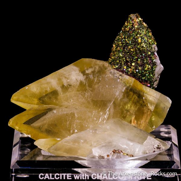 This is a Calcite with Chalcopyrite from Fletcher Mine, West Fork, Reynolds Co., Missouri, USA. From a unique and surprising find of around 2020, this is a sculptural pair of doubly terminated calcite crystals aesthetically attached to a third, doubly-terminated calcite that is almost completely covered in chalcopyrite crystals from the Fletcher Mine in Reynolds County, Missouri.Data last checked on 28th Jan 2026