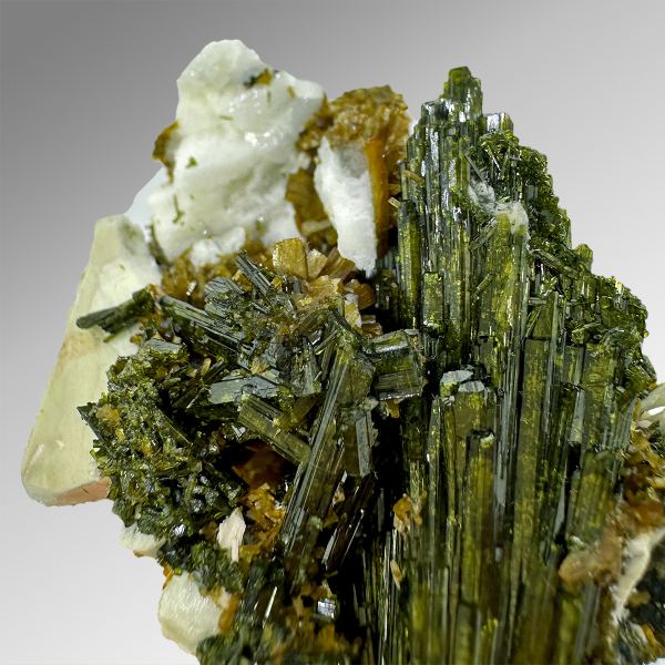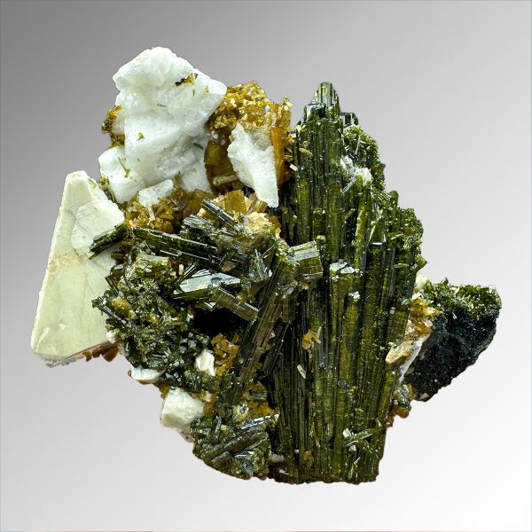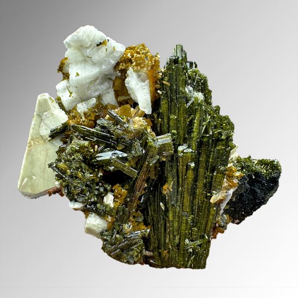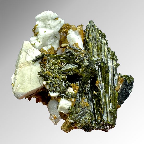 Aesthetic combo of lustrous, green epidote crystals combined with orangish stilbite, white albite and microcline. Great luster. Ex. Ireneusz Niemczyk collection.Data last checked on 16th Dec 2025 - specimen may no longer be available