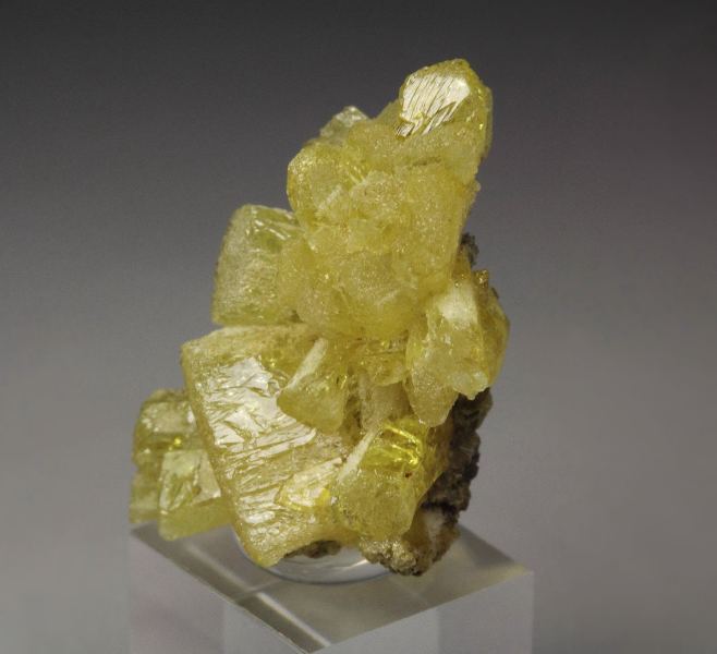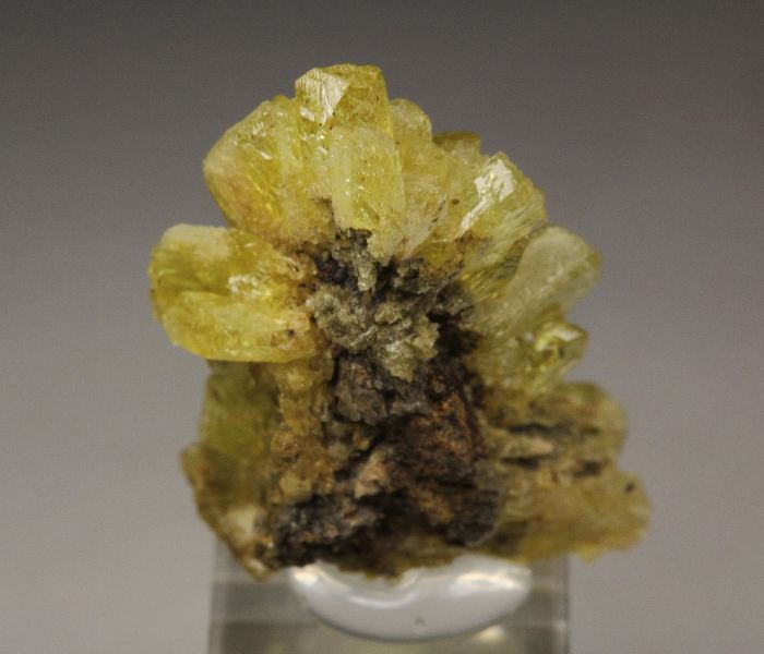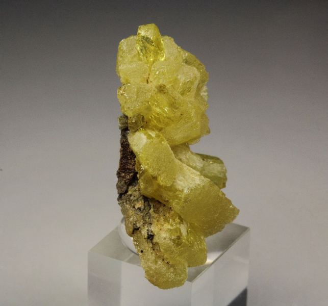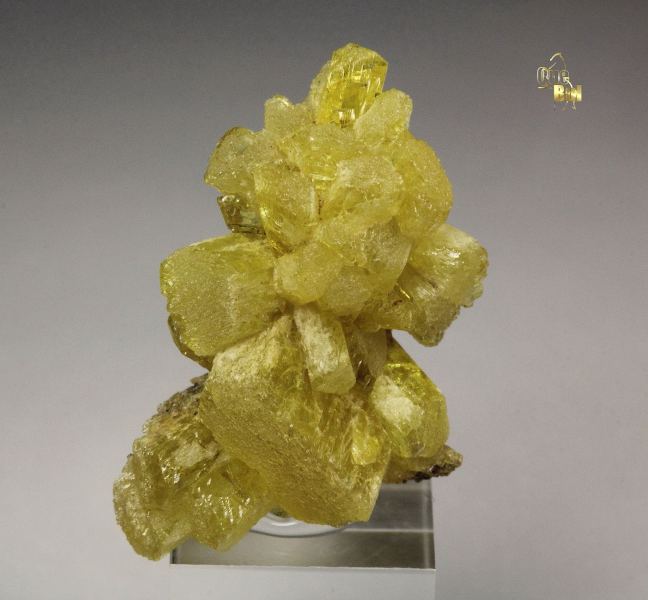 Unusual and rare legrandite crystals from the famous Ojuela Mine, Mexico. It comes with 2013 label from John Betts Fine Minerals. The crystals grow in a cluster. They are prismatic with uncommon flat terminations. They have canary-yellow color and good luster. Some crystals are slightly gemmy. Legrandite is one of the most desirable and rare minerals from Ojuela mine. In very good conditions. On acrylic base., Cool!, Data last checked on 18th Dec 2025 - specimen may no longer be available