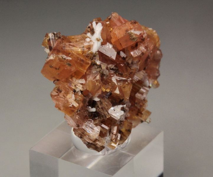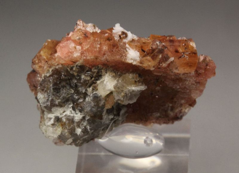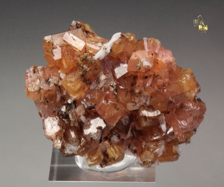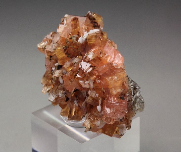 A nice specimen of slightly gemmy serandite crystals from the famous Poudrette quarry, Mont Saint-Hilaire, Quebec, Canada. The crystals have a sharp cubic habit. They are translucent to transparent with a rich salmon-pink color. The luster is strong and the crystals are sparkling. Some unidentified minerals are seen too. For references see the 1990 issue of The Mineralogical Record vol. 21, # 4. In very good condition – some side contacts. On acrylic base., Pleasing!, Data last checked on 20th Dec 2025