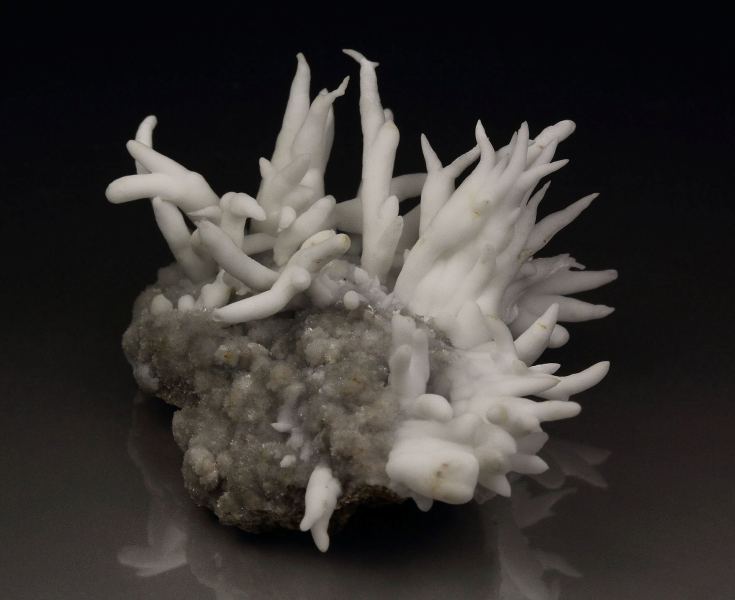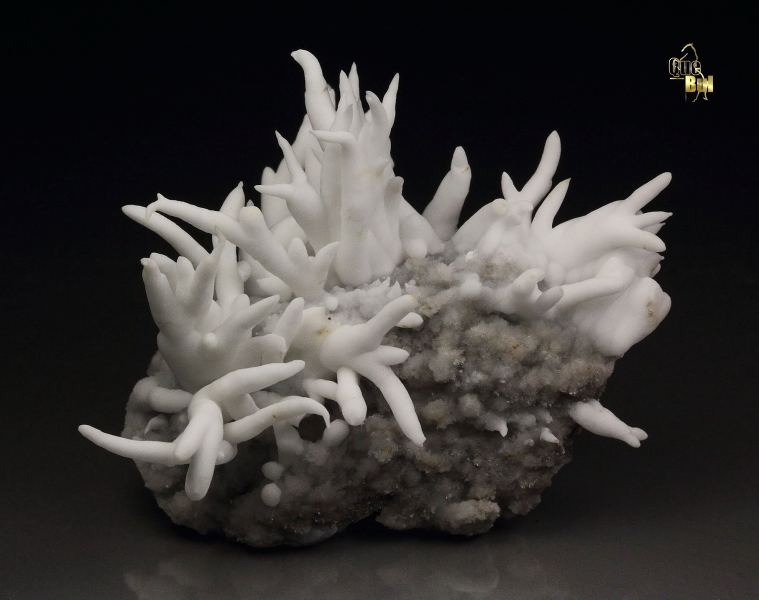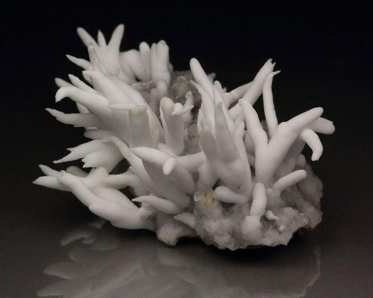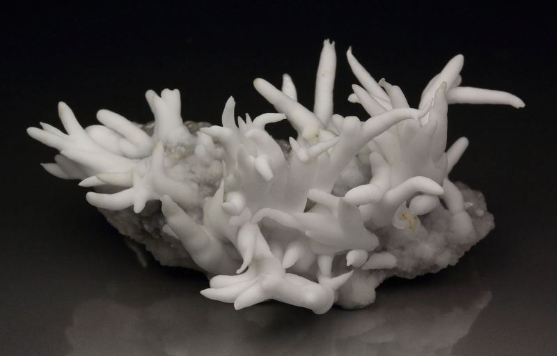 A gorgeous specimen of aragonite var. flos ferri from the famous locality of Sainte-Marie-aux-Mines, Colmar-Ribeauville, France. The aragonite crystals are snow white. They form an attractive structure of elongated “stalactites”. Very sculptural and airy. The specimen is complete all over. In excellent condition., Mesmerizing!, Data last checked on 22nd Dec 2025