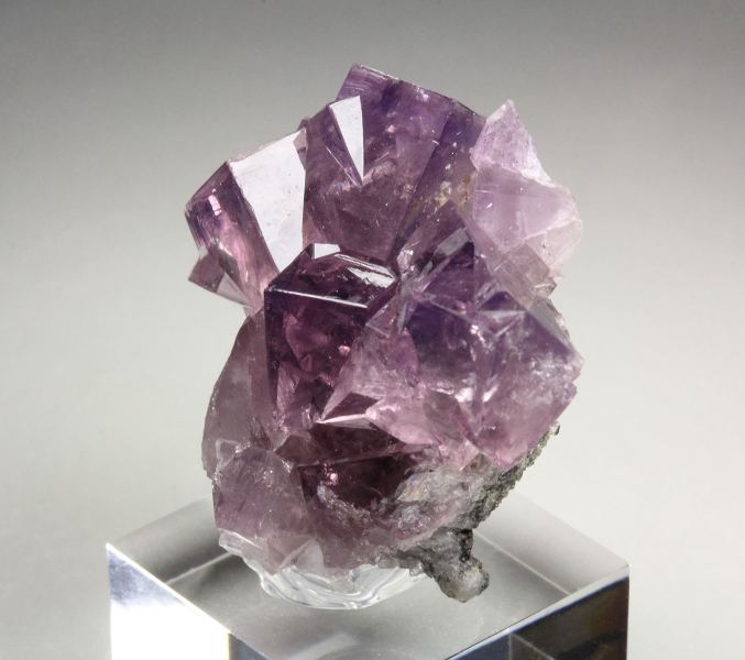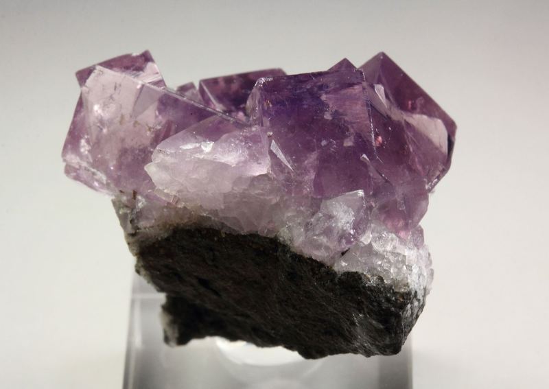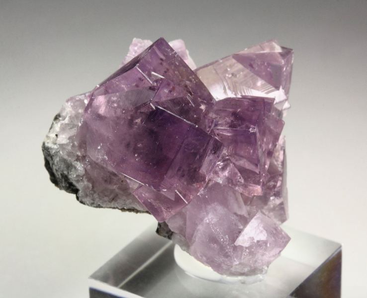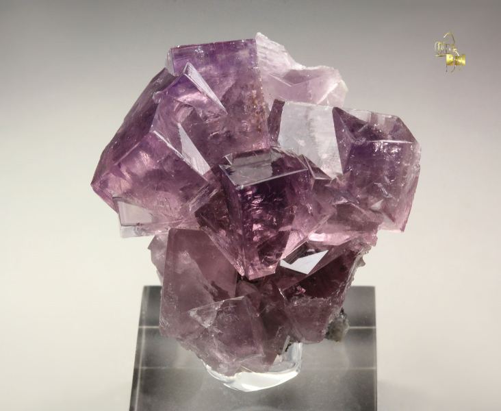 A cool specimen of fine fluorite cubes to 12mm from the famous Heights Mine, County Durham, United Kingdom. The razor sharp crystals are lustrous and highly transparent. The real beauty in this specimen is the uncommon purple color combined with the amazing clarity. It shows a penetration twinning. Under UV light and daylight the fluorite is strongly fluorescent. In good condition – some minor nicks and outside edge contacts. On acrylic base., Flamboyant!, Data last checked on 24th Dec 2025