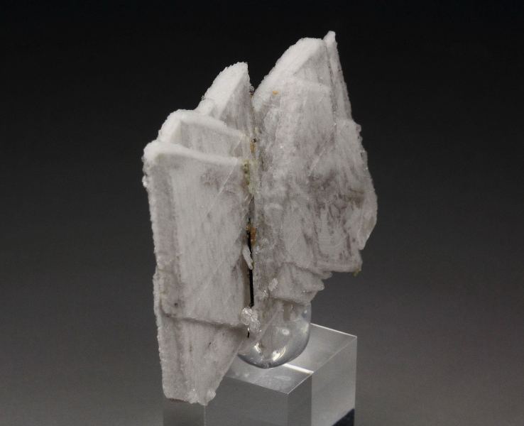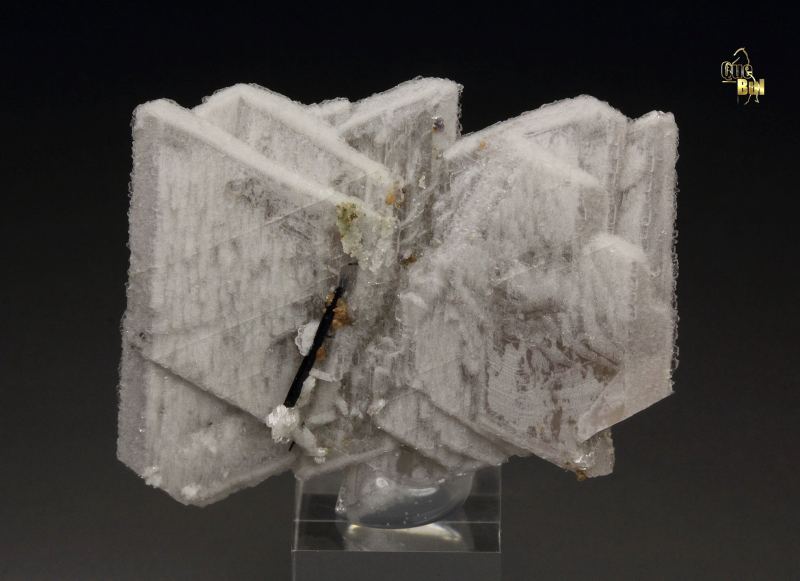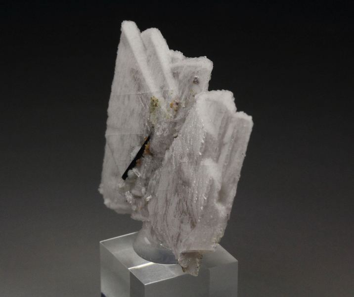 An aesthetic and unique style specimen of albite from the famous Poudrette quarry, Mont Saint-Hilaire, Quebec, Canada. Colorless albite forms very flat, sharp tabular crystals. They are opaque and lustrous. Black aegirine needle is seen too. For references see the 1990 issue of The Mineralogical Record vol. 21, # 4. In very good condition – base part contact. On acrylic base., Superb!, Data last checked on 28th Dec 2025