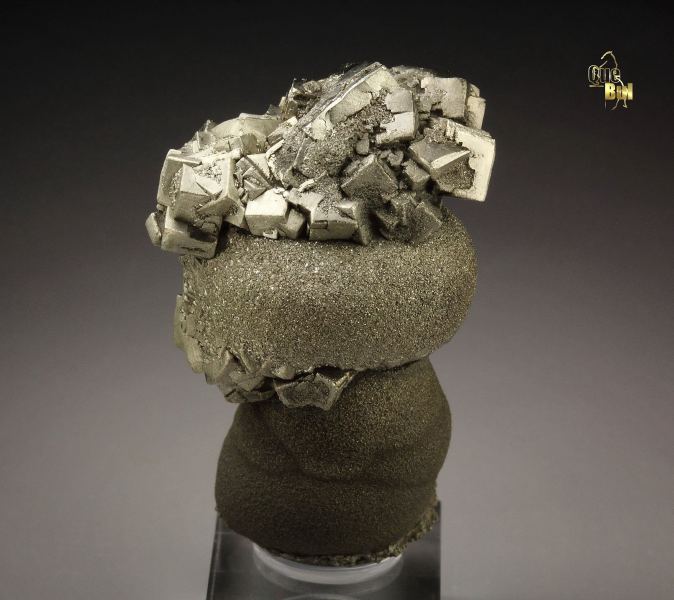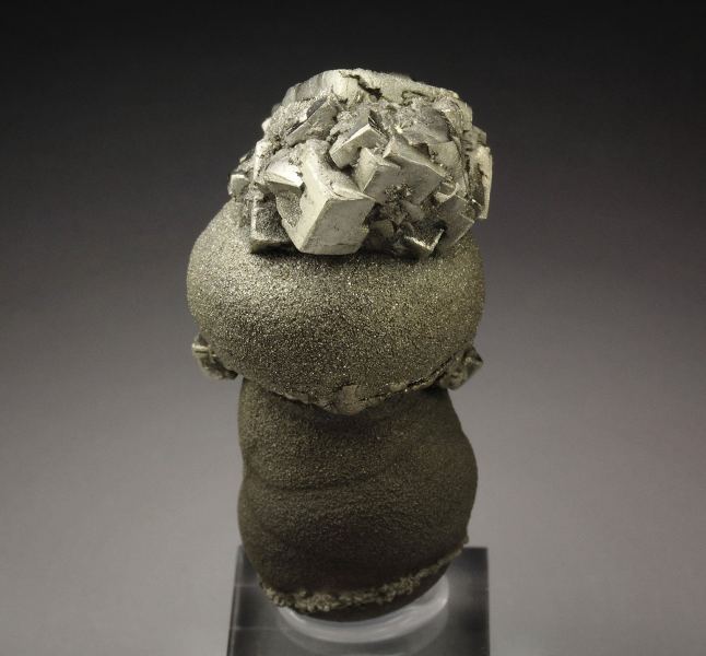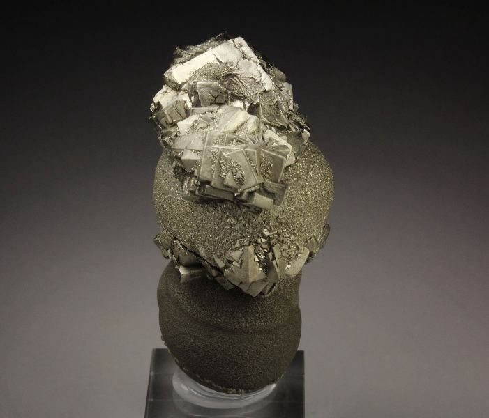 A superb and rare specimen of pyrite crystals from this uncommon locality - Shoal Point, Newfoundland, Canada. These Canadian pyrites are very distinctive. They are found in shale. The crystals are matt lustrous and shiny cubes with brassy yellow color. The base is rounded probably by water. It displays attractively all over 360 degree. It is a floater. In excellent condition. On acrylic base., Unique pyrite!, Data last checked on 30th Dec 2025
