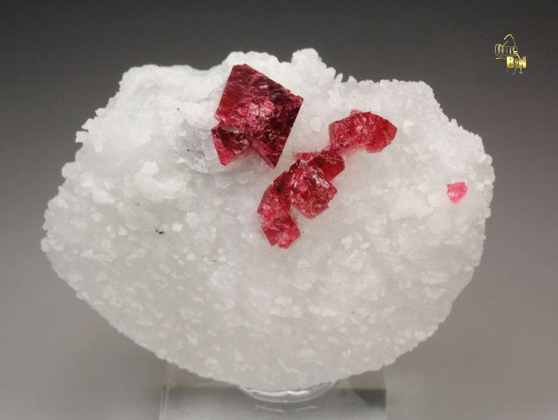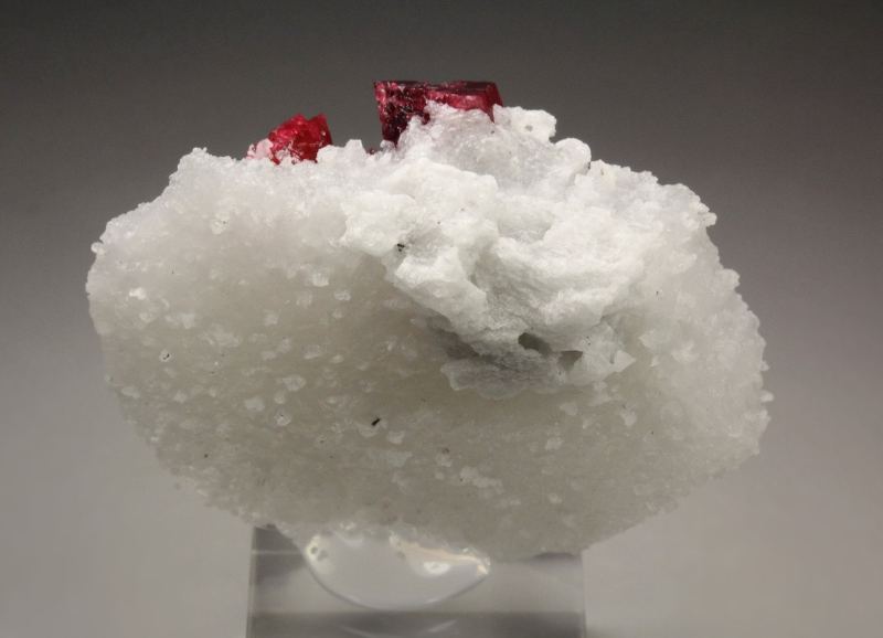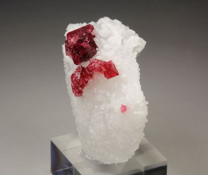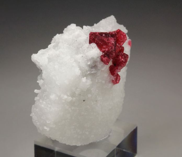 A mesmerizing specimen of gemmy spinel crystals sitting on a white marble base from Mogok Township, Myanmar. The spinel crystals to 8mm are sharp octahedrons with a good shape. The quality is very good – translucent to transparent and gemmy crystals. They have a striking and saturated raspberry-red color and good luster. The white base outlines strongly the spinels and they form an excellent focal point at the top. For references see the 2022 issue of The Mineralogical Record vol. 53, # 1. In very good condition – some natural imperfections. On acrylic base., Gorgeous!, Data last checked on 1st Jan 2026
