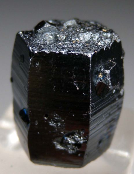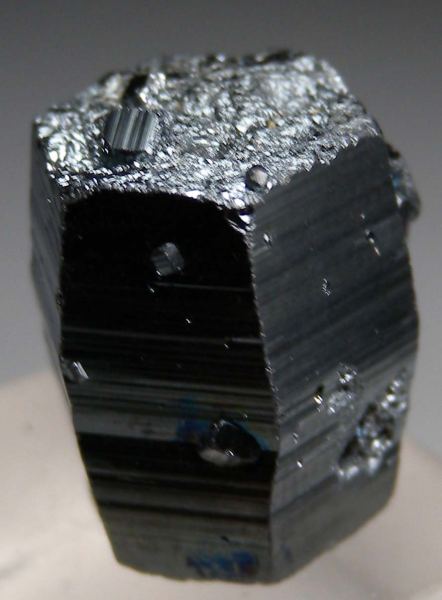 Single, stout hexagonal prism of Hematite, an uncommon crystal form for Hematite that reminds me of a style rarely seen in Kalahari Hematite crytals. Partially doubly-terminated crystal silvery in color with bright metallic luster. Complete and undamaged with uniform shape and smaller attached crystals. These are found in an iron mine on an island located 8 kilometers off the coast of Iran.Data last checked on 8th Jan 2026 - specimen may no longer be available