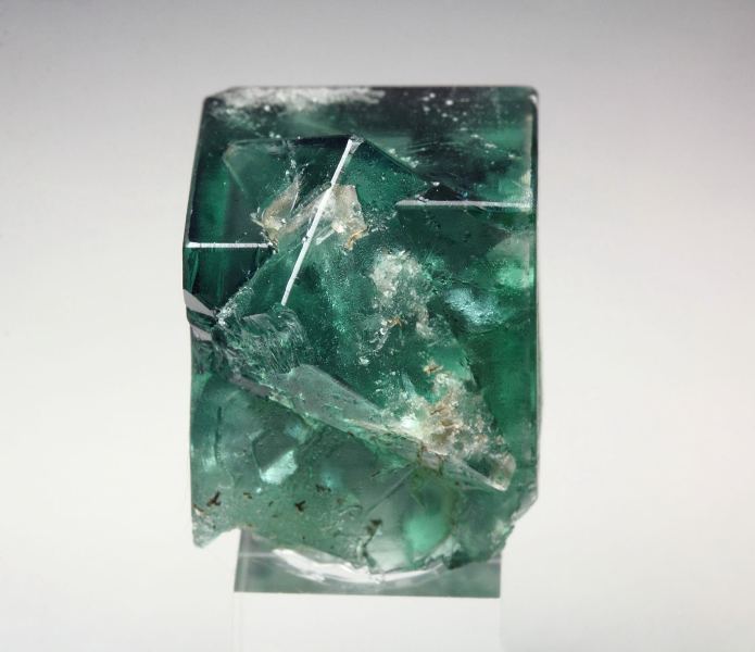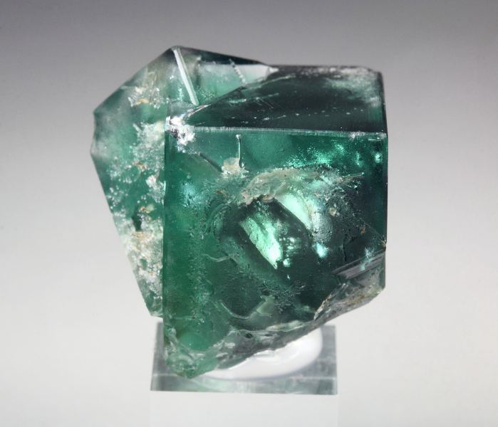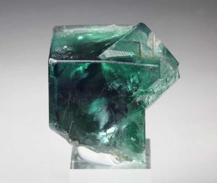 A nice specimen of fluorite cubes from the famous Heights Mine, County Durham, United Kingdom. The sharp crystals are lustrous and highly transparent. The real beauty in this specimen is the very intense and saturated emerald-green color combined with the amazing clarity. Inside are seen cubic purple phantoms. It shows a good twinning. Under UV light and daylight the fluorite is strongly fluorescent. Some contacts and imperfections. On acrylic base., Pleasing!, Data last checked on 9th Jan 2026 - specimen may no longer be available