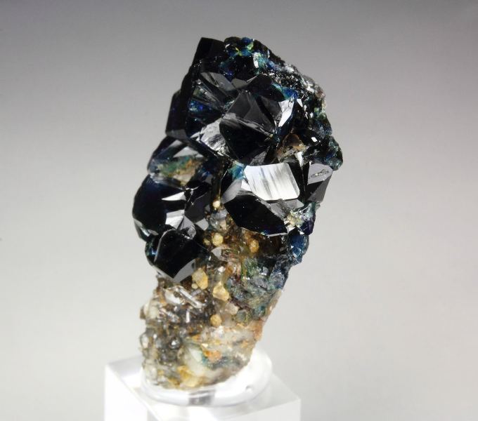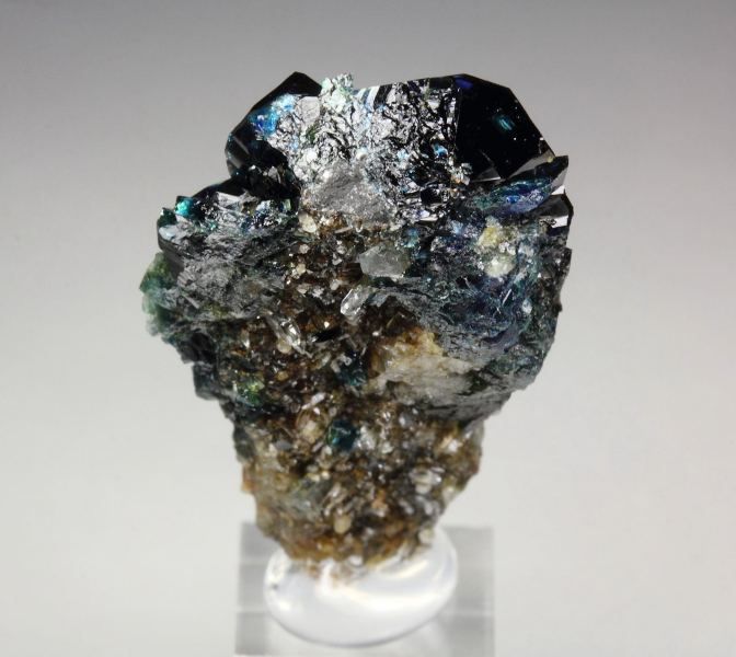 A fine specimen of gemmy lazulite crystals with quartz and fluorapatite from the famous phosphate deposits of Yukon. Lazulite is a rare magnesium aluminum phosphate and some of the finest come from this locality. The lazulite crystals are sharp, highly lustrous, very well formed, monoclinic, deep indigo blue color measuring up to 8mm. Many crystals have gemmy areas with a striking royal-blue and green color. Transparent quartz crystals add a nice contrast. Small fluorapatite crystals are seen too. For references see the 1992 issue of The Mineralogical Record vol. 23, # 4. In excellent condition – some outside edge contacts. On acrylic base., Gorgeous!, Data last checked on 13th Jan 2026