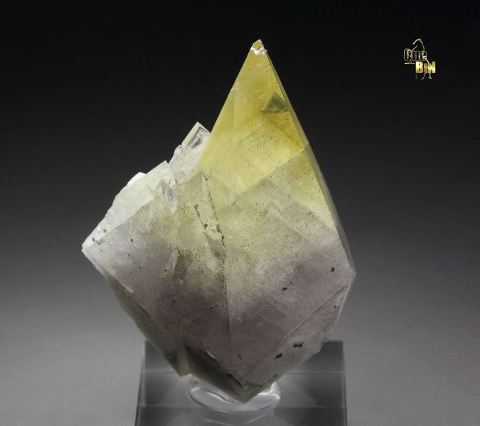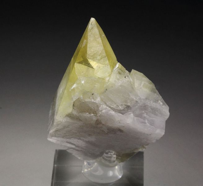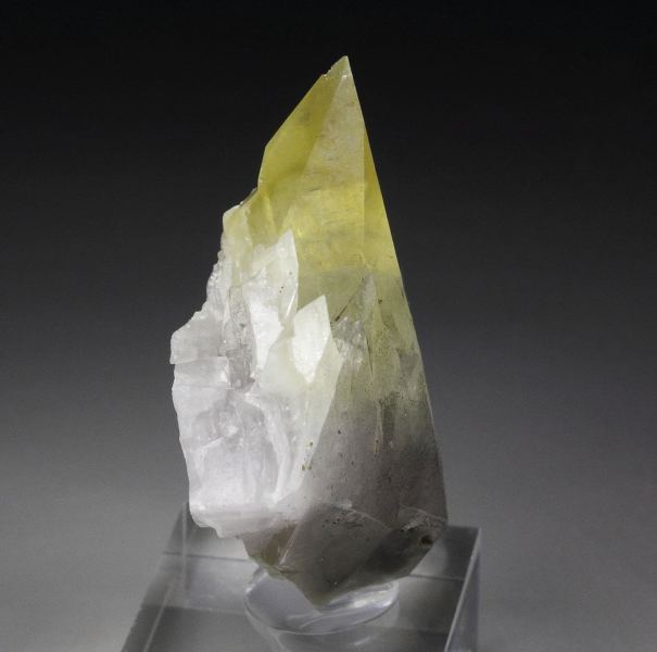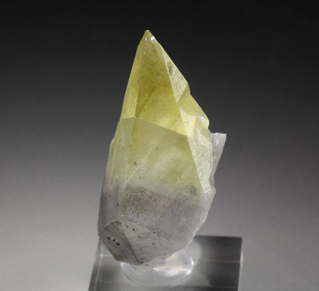 An elegant calcite specimen from Trudeau quarry, Quebec, Canada. The crystal is razor sharp and lustrous scalenhedron. It is colorless at the bottom to yellow at the top. Small pyrite inclusions are seen too. It is slightly fluorescent. In very good condition – one natural imperfection back side at the tip and some contacts on the back. On acrylic base., Marvelous!, Data last checked on 15th Jan 2026