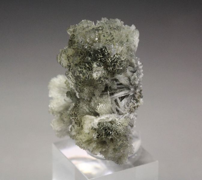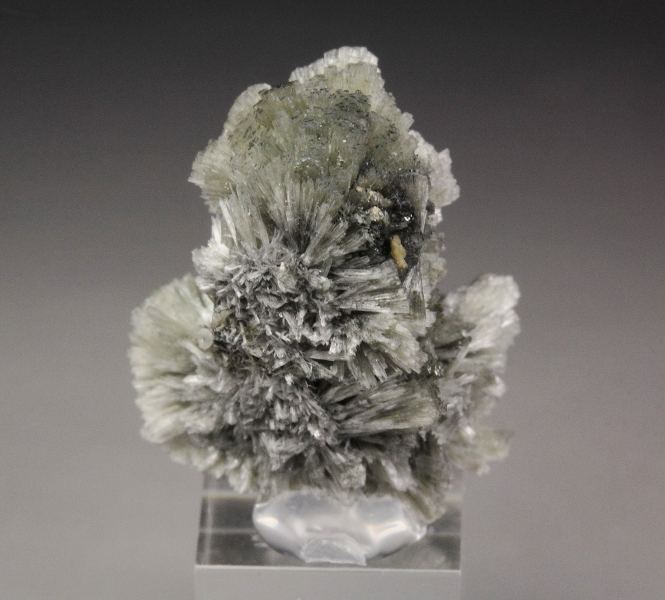 A fascinating specimen of rare hydrated sodium zirconium silicate elpidite from this great locality - Mont Saint-Hilaire, Quebec, Canada. It displays light olive-green elpidite needles forming delicate radial sprays. They are lustrous and sparkling. In excellent condition. On acrylic base., Choice elpidite!, Data last checked on 17th Jan 2026