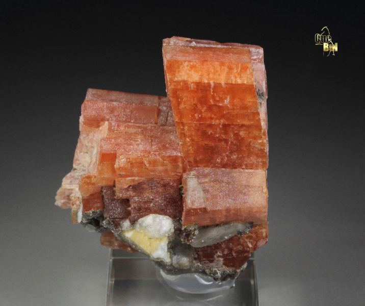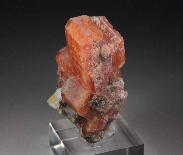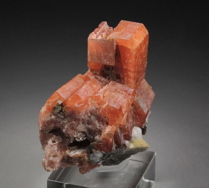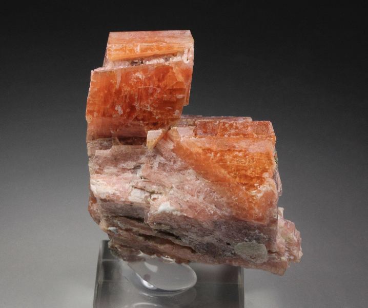 An outstanding specimen of colorful serandite crystals decorated with natrolite, analcime and manganoneptunite from this great locality - Mont Saint-Hilaire, Quebec, Canada. Mont Saint-Hilaire produced the best serandite in the world and this is a stunning specimen. It displays well crystallized serandite with classic and rich salmon pink color. The luster is strong. It is opaque to translucent with gemmy zones and crystals up to 43mm. Moreover, the piece has of character given by the association of white analcime and colorless natrolite crystal. Manganoneptunite with red-brown color is seen too. Rare now high quality specimen. For references see the 1990 issue of The Mineralogical Record vol. 21, # 4. Some contacts. On acrylic base., World grade quality serandite from Mont Saint-Hilaire!, Data last checked on 19th Jan 2026