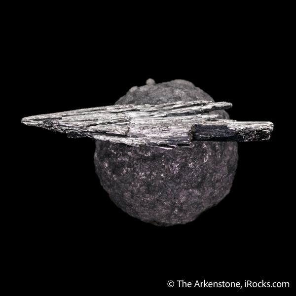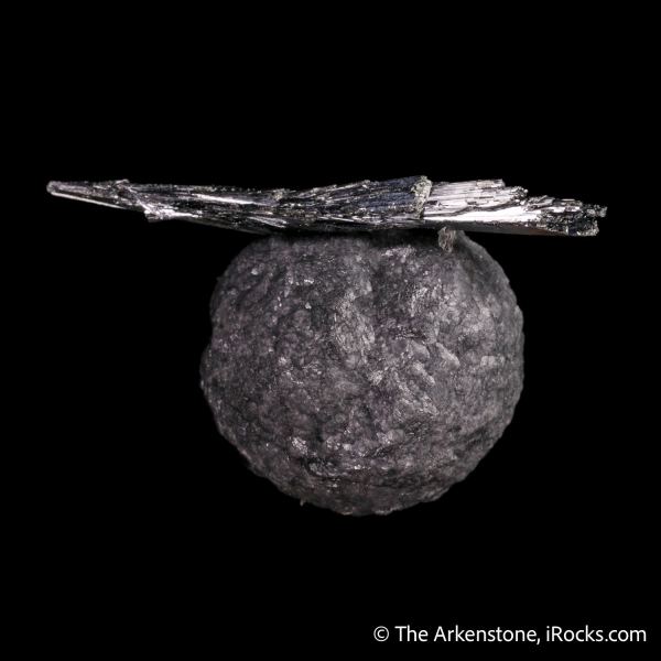 This is a Stibnite on Calcite included by Boulangerite from Herja Mine, Baia Mare, MaramureČ™ Co., Romania. We are certainly aware that this looks quite like somebody took a stibnite and glued it to a calcite ball...but this crazy geometric assemblage of a stibnite cluster floating on a perfect spherical calcite, is simply nature in all its surprise.Data last checked on 24th Jan 2026