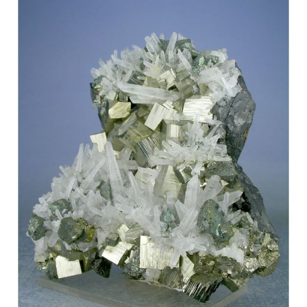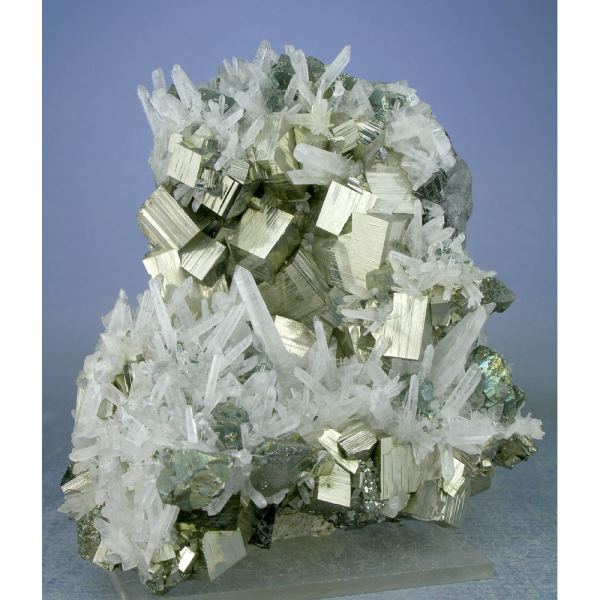 A brilliant specimen of beautifully formed Pyrite crystals with Quartz and Sphalerite from the Huaron mine in Peru. It features numerous wonderfully striated cubes of shiny golden Pyrite sitting on a matrix of Sphalerite and accompanied by an attractive grouping of needle-like Quartz crystals. A very nicely balanced display specimen, with excellent contrast and composition. This specimen is from my personal collection.Data last checked on 28th Jan 2026 - specimen may no longer be available