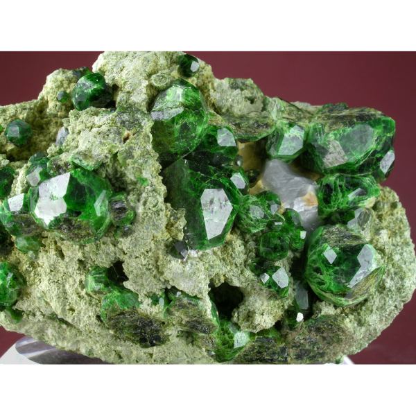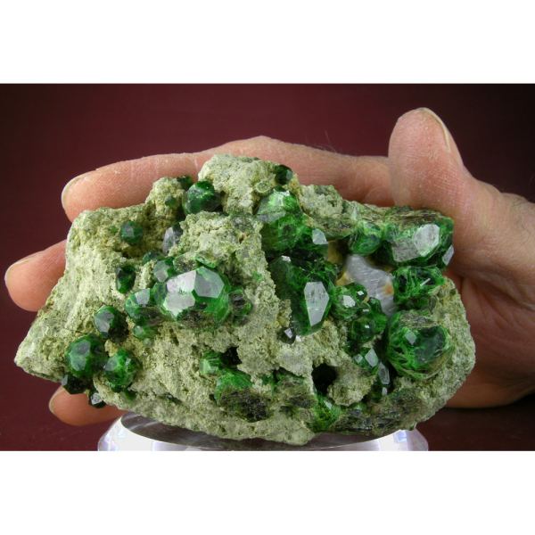 A large and quite striking specimen featuring numerous crystals of chromium-rich Demantoid garnet artfully distributed over a nicely contrasting light-gray matrix. Top color and luster in a nicely composed specimen with excellent presentation for display. Lots of fine details for you to explore all over.Data last checked on 1st Feb 2026