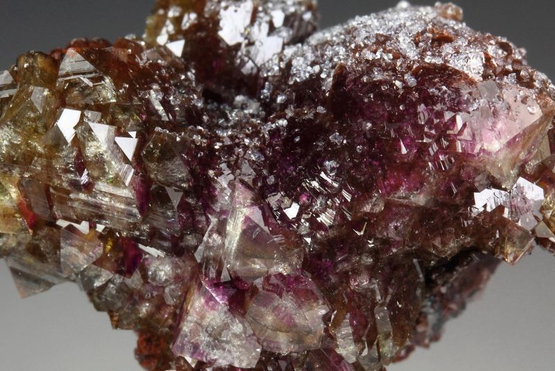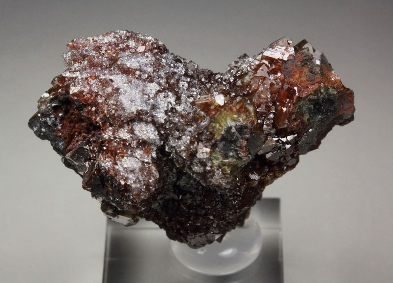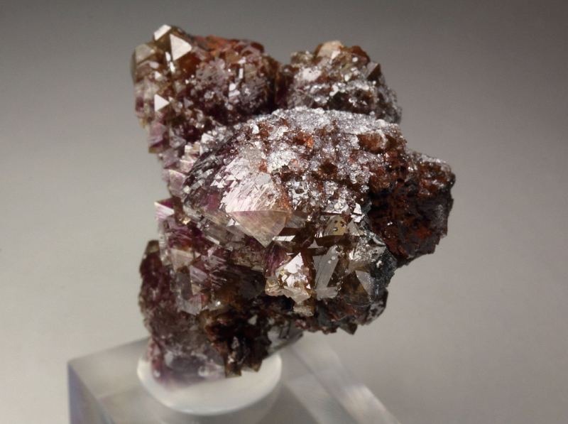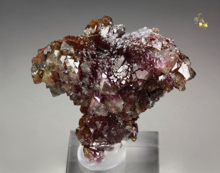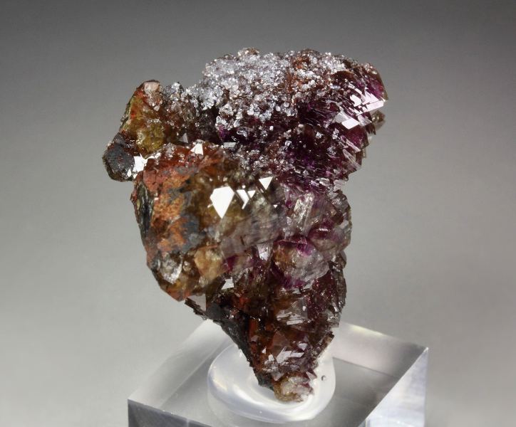 A gorgeous specimen of richly purple colored and gemmy adamite var. manganoan adamite from the famous Ojuela Mine, Mexico. The crystals are with a sharp habit and form an elegant heart shape . They are from amber to rich purple colored. The faces have a strong luster and nice gemminess. A pleasing addition is small colorless and transparent unidentified crystals, sitting at the top. In excellent condition. On acrylic base., Astonishing manganoan adamite!, Data last checked on 6th Feb 2026