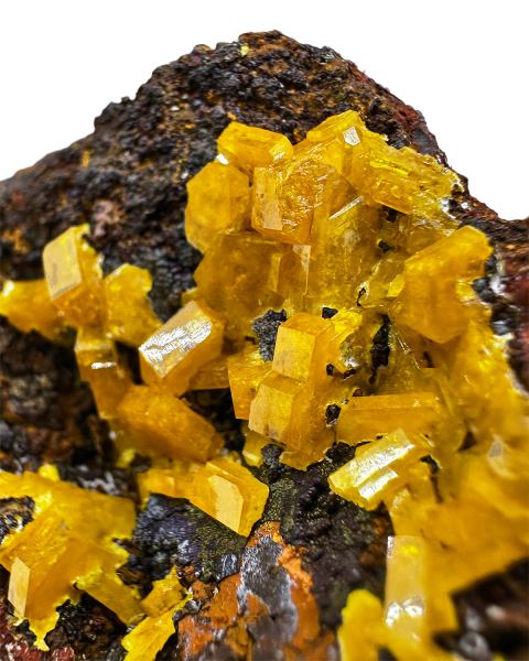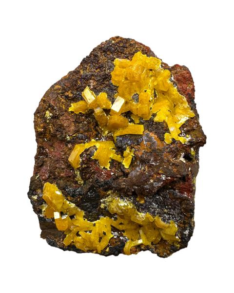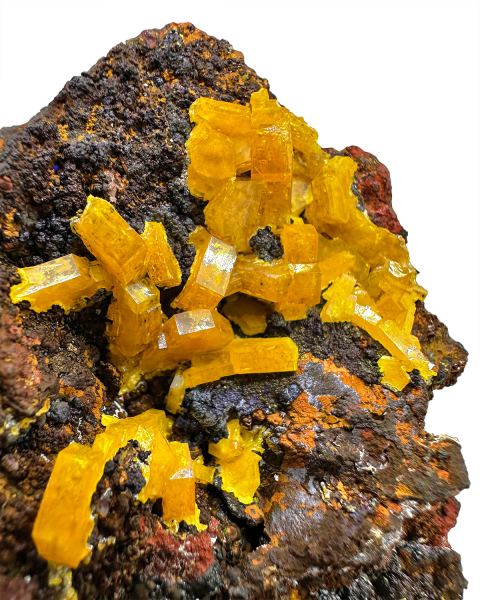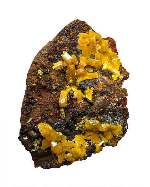 Specimen of bright orange mimetite crystals on contrastive brownish matrix. Good color and luster. ; HERE you can read our article about this discovery.Data last checked on 8th Feb 2026 - specimen may no longer be available