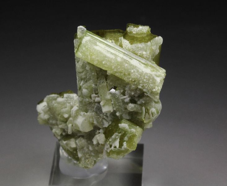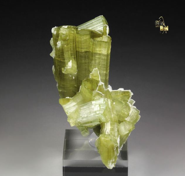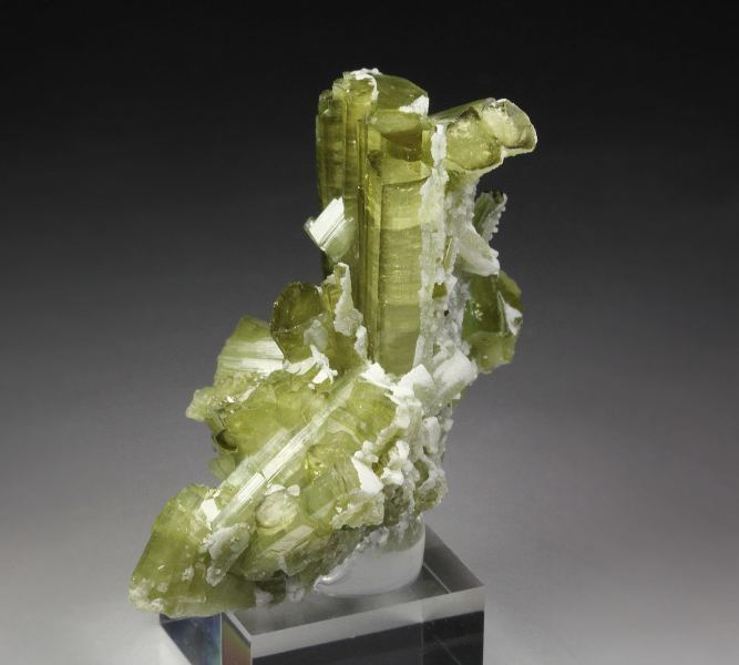 A highly aesthetic specimen of tourmaline var. elbaite crystals from Chhappu, Shigar District, Pakistan. The elbaite crystals have a pleasing apple-green color. They are very well terminated, transparent and gem with a high luster and superb surface striations. In excellent condition. On acrylic base., Beauty!Data last checked on 18th Feb 2026