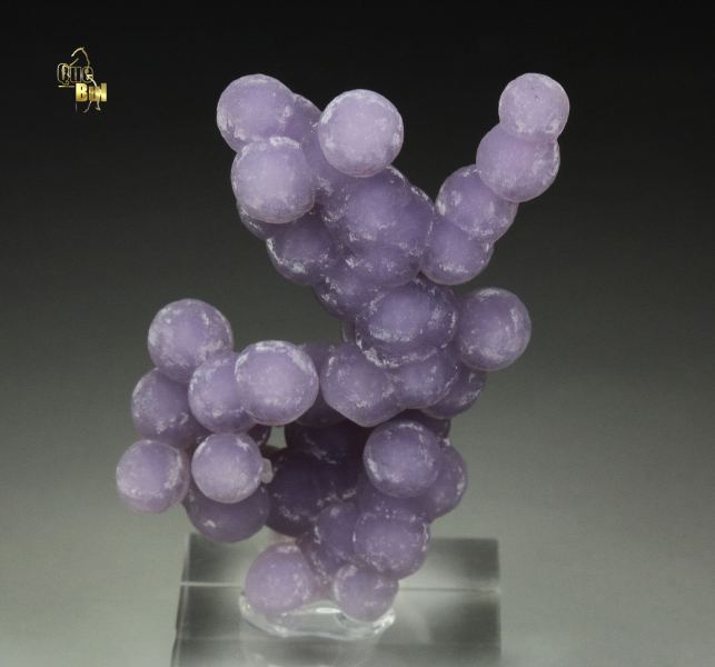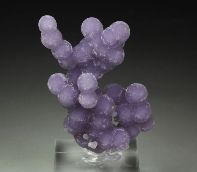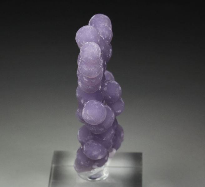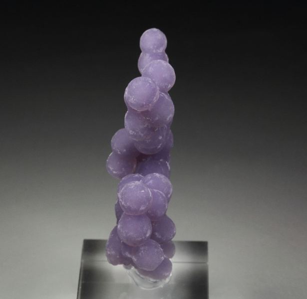 A fascinating specimen of quartz var. amethyst spheres growing in a sculptural cluster from Mamuju Regency, Indonesia. This is so called grape agate. Very attractive arrangement of amethyst spheres one atop another. They are very fresh and sparkle strongly. The color is lavender. It is complete all over. For references see the 2018 issue of The Mineralogical Record vol. 49, # 6. In excellent condition. On acrylic base., Cool grape agate!, Data last checked on 18th Feb 2026