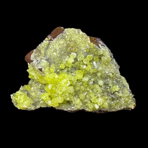 Specimen of lustrous, bright yellow mimetite crystals on contrastive brownish matrix. Great color and luster. ; HERE you can read our article about this discovery.Data last checked on 20th Feb 2026