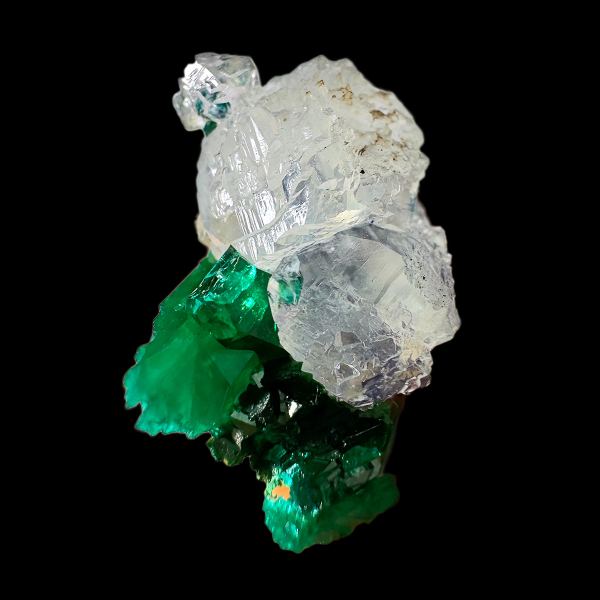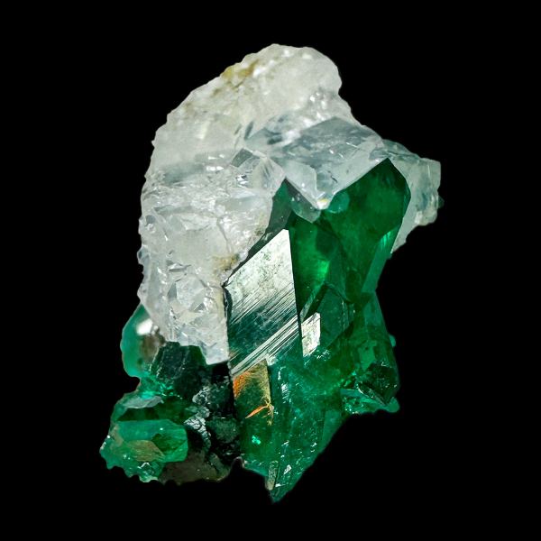 Small specimen of emerald green dioptase crystals with contrastive calcite. Great luster. ;Data last checked on 22nd Feb 2026