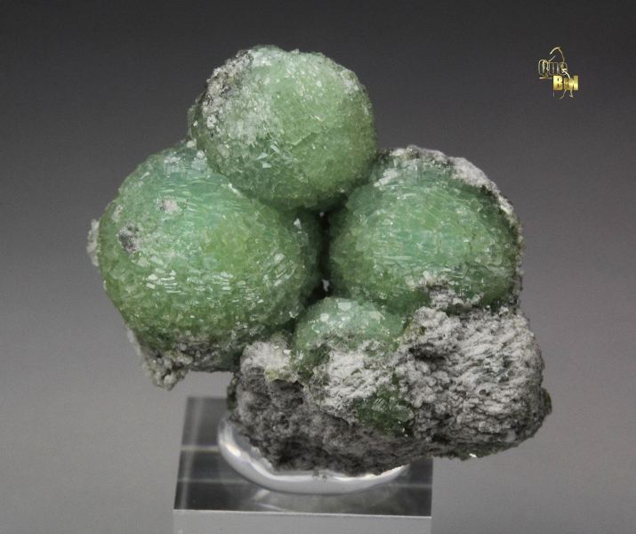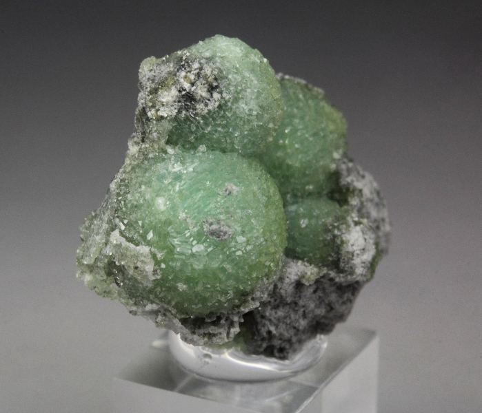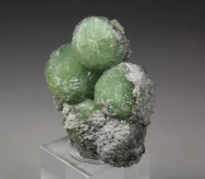 A cute specimen of three wavellite spheres from Montgomery Co.,Arkansas, USA. It displays well shaped spheres of botryoidal wavellite with a light green color. They are well shaped, fresh and sparkling. In very good condition – some small contacts. On acrylic base., Marvelous!Data last checked on 22nd Feb 2026 - specimen may no longer be available