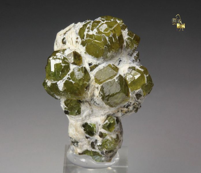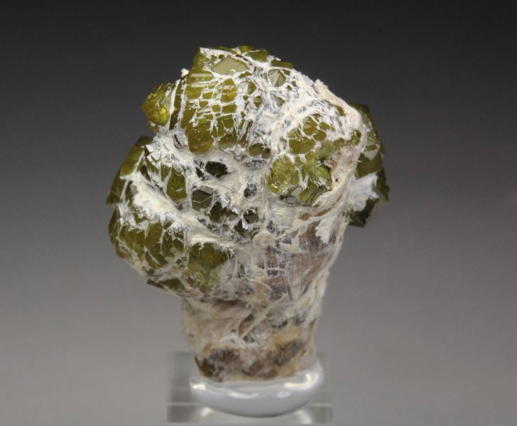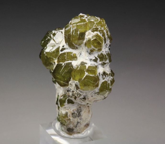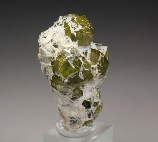 A marvelous specimen of gemmy garnet var. andradite var. demantoid crystals from the famous Malenco Valley, Italy. The demantoid crystals to 3mm have rhombic dodecahedral habit. They are lustrous, light reflective and gemmy. The color is pleasing apple-green and the crystals are sparkling. It displays aesthetically all over 360 degree. In excellent condition. On acrylic base., Fantastic! Data last checked on 24th Feb 2026