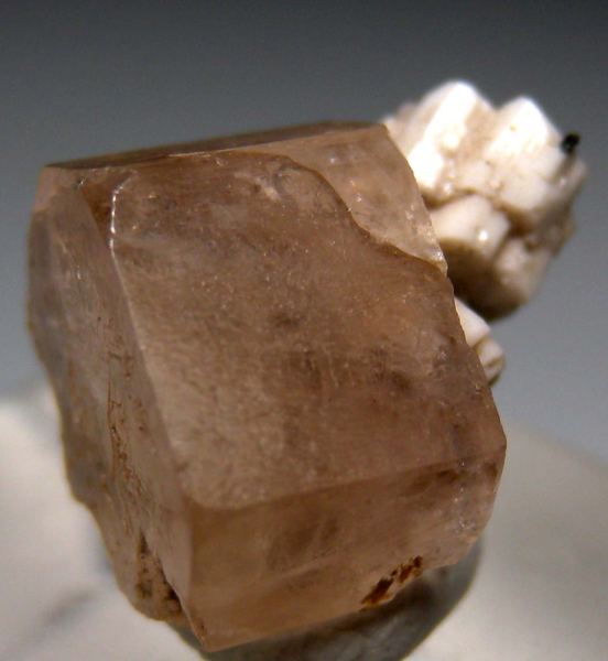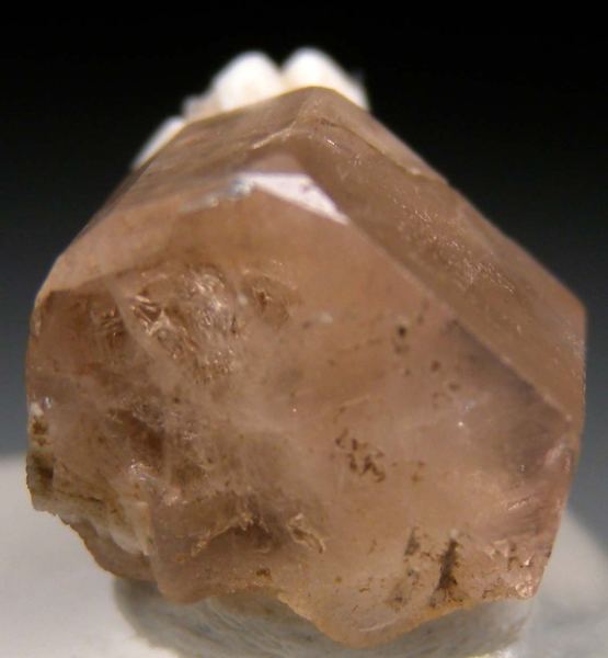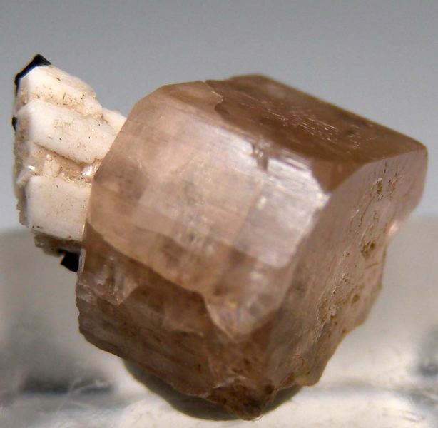 Glassy and gemmy (!) single Zektzerite crystal with attached Orthoclase. The crystal is undamaged, pale pinkish in color, with areas of glassy transparency.Data last checked on 25th Feb 2026
