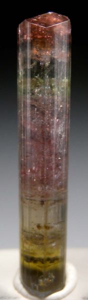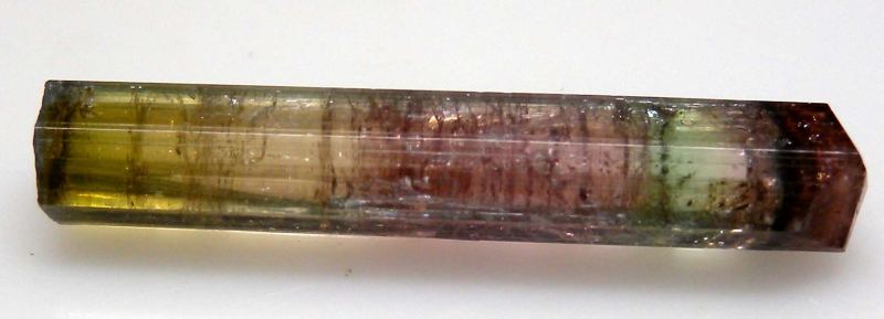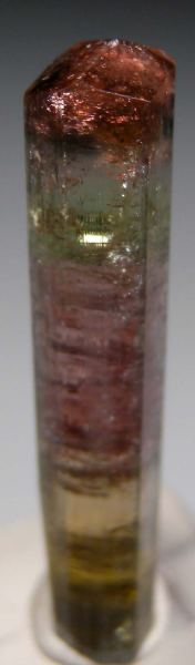Colorful single Tourmaline crystal with multiple color zones of yellows, pinks, greens, and red at the termination. Complete all around and undamaged. This is a rare, hard to find Tourmaline crystal found in a series of 5 pockets, each no larger than a softball. Weighs 1.82 grams.Data last checked on 28th Feb 2026