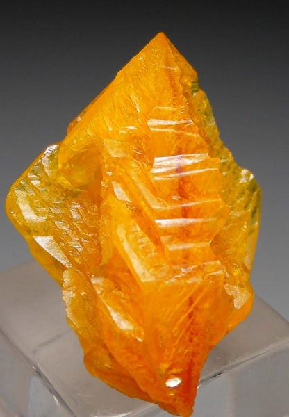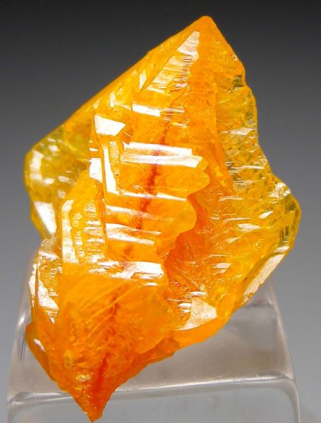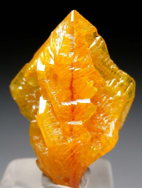 Thick, flame-like single Wulfenite crystal from Iran. Yellow-orange color with a red line running up the center. A thick crystal with unusual 'honey-comb' growth seen along the sides. Complete and undamaged.Data last checked on 28th Feb 2026