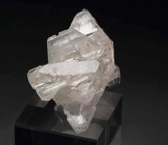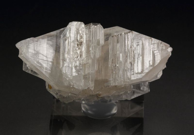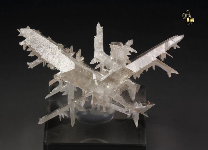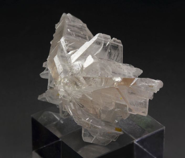 A beautiful specimen of reticulated cerussite from Nakhlak Mine. The reticulated growth is due to a cyclic twinning. The blades are parallel, highly lustrous and colorless. The piece is very well shaped all over and delicate. Small orange wulfenite crystals are seen too. For references see the 2023 issue of The Mineralogical Record vol. 54, # 3. In very good condition – one crystal on the back side damaged. On acrylic base., Snowflake!, Data last checked on 28th Feb 2026