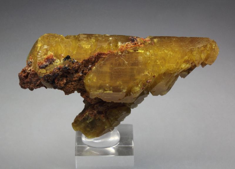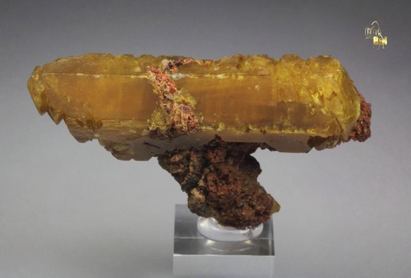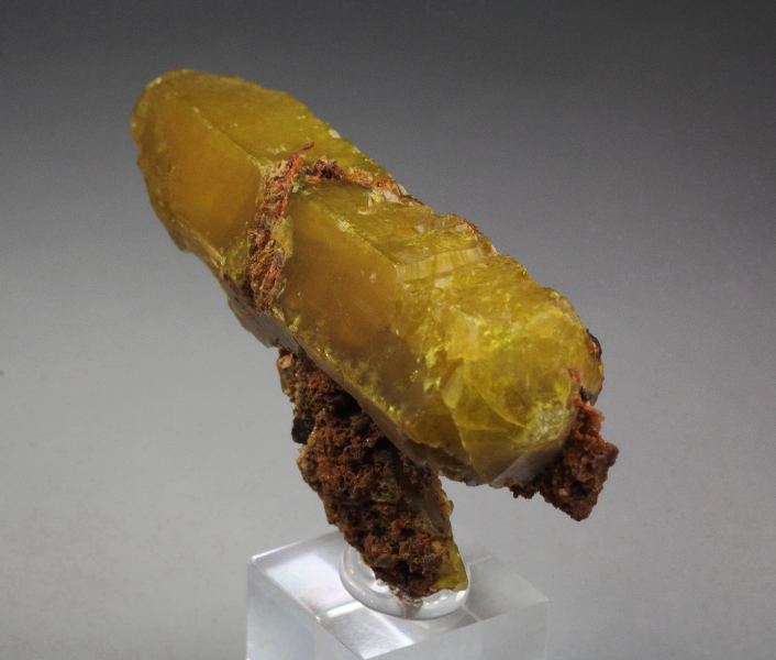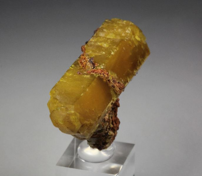 An impressive 37mm sturmanite crystal from the famous N Chwaning Mines, Kalahari manganese fields, South Africa. It displays an orange colored crystal with good hexagonal prismatic shape and matt luster. It is complete all over and doubly terminated. For references see the 2017 issue of The Mineralogical Record vol. 48, # 1. In very good condition – some natural imperfections and minor nicks. On acrylic base., Outstanding sturmanite!, Data last checked on 2nd Mar 2026 - specimen may no longer be available