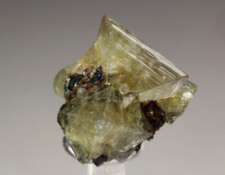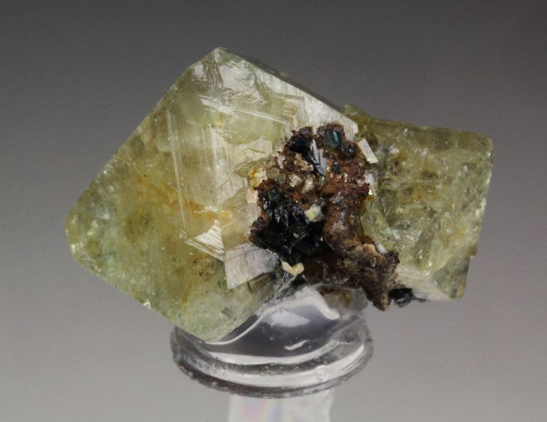 A cool specimen of glassy wardite crystals with lazulite from Rapid Creek - the famous phosphate deposits of Yukon, Canada. The wardite crystals are sharp, glassy lustrous, very well formed with a sharp octahedral habit. They are gemmy and almost colorless, yellow-green hue. Small lazulite crystals are seen too. For references see the 1992 issue of The Mineralogical Record vol. 23, # 4. In very good condition – minor back side contacts. On acrylic base., Splendid!, Data last checked on 4th Mar 2026