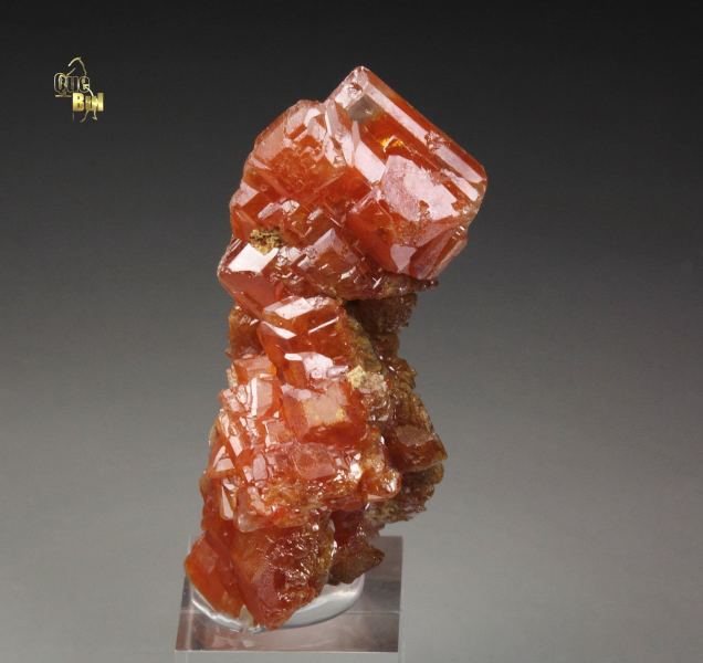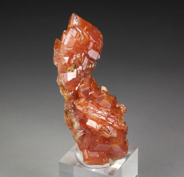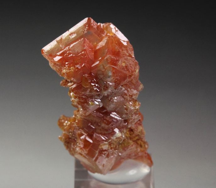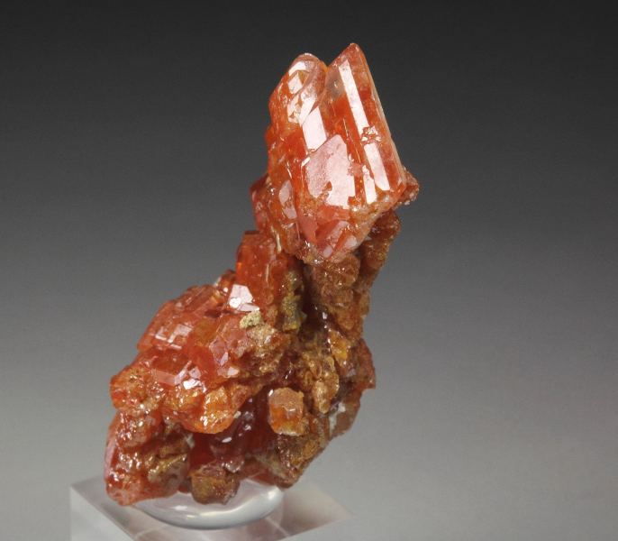 Very rare old specimen of orange-red wulfenite crystals from Sortuz, Karaganda Region, Kazakstan. It is accompanied by an original vintage label listing the locality as Sit-Schag, Kazakstan. “Sit-Schag” is an old USSR-era locality name for a recognized wulfenite occurrence, though it does not correspond to modern Kazakh geographic terminology. The crystal habit and overall morphology are fully consistent with known specimens from Sortuz, making this attribution highly likely. It displays wulfenite crystals to 9mm growing in a cluster. They are sharp, flat tabular crystals with beveled edges. The color is vivid orange-red. The crystals are medium lustrous and well light reflective. They show some transparency. In very good condition – some small nicks. On acrylic base., A choice and uncommon example of these Kazakhstan rarities!, Data last checked on 4th Mar 2026